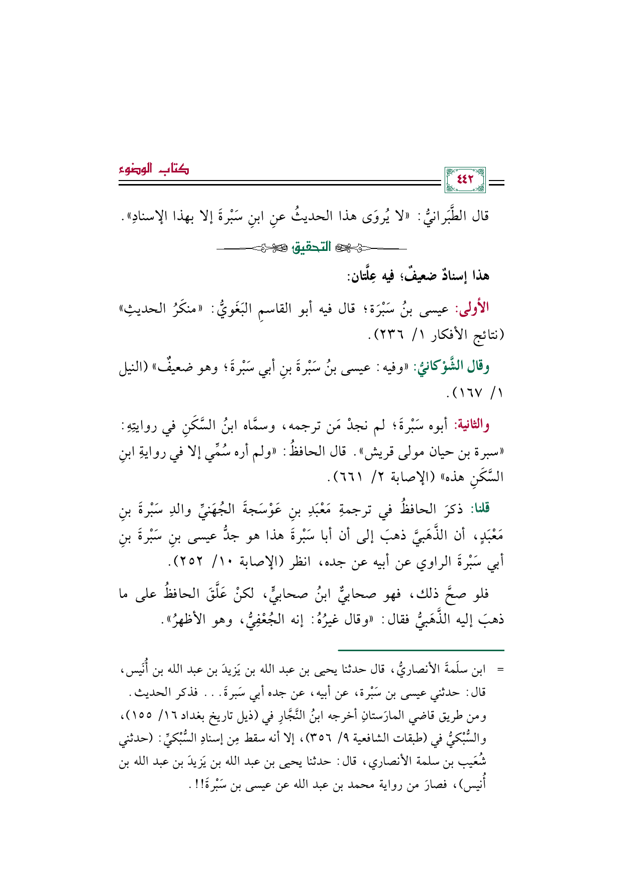 الأولى: عيسى بنُ سَبْرَة؛ قال فيه أبو القاسمِ البَغَويُّ: "منكَرُ الحديثِ" (نتائج الأفكار ١/ ٢٣٦).