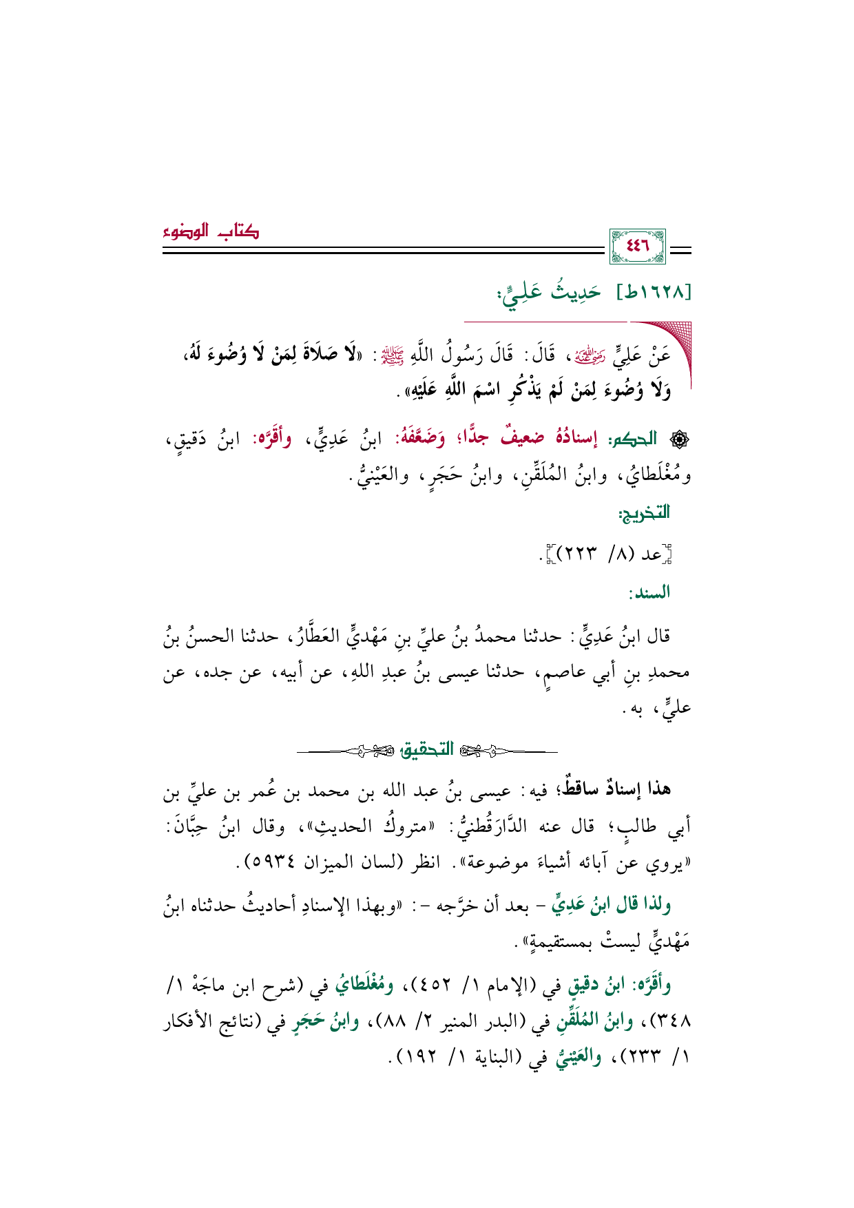 وأقَرَّه: ابنُ دقيقٍ في (الإمام ١/ ٤٥٢)، ومُغْلَطايُ في (شرح ابن ماجَهْ ١/ ٣٤٨)، وابنُ المُلَقِّنِ في (البدر المنير ٢/ ٨٨)، وابنُ حَجَرٍ في (نتائج الأفكار ١/ ٢٣٣)، والعَيْنيُّ في (البناية ١/ ١٩٢).