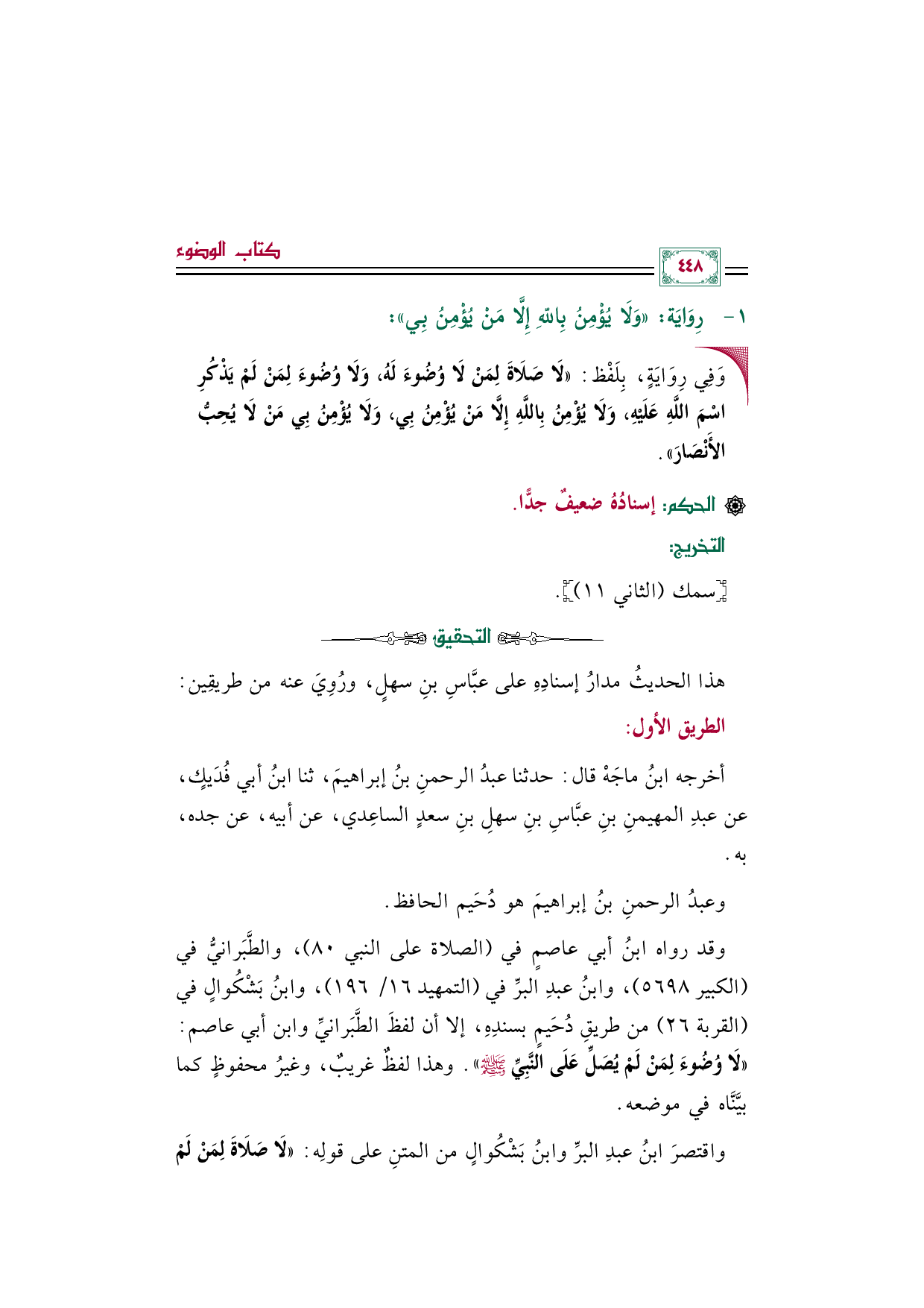 وقد رواه ابنُ أبي عاصمٍ في (الصلاة على النبي ٨٠)، والطَّبَرانيُّ في (الكبير ٥٦٩٨)، وابنُ عبدِ البرِّ في (التمهيد ١٦/ ١٩٦)، وابنُ بَشْكُوالٍ في (القربة ٢٦) من طريقِ دُحَيمٍ بسندِهِ، إلا أن لفظَ الطَّبَرانيِّ وابن أبي عاصم: «لَا وُضُوءَ لِمَنْ لَمْ يُصَلِّ عَلَى النَّبِيِّ صلى الله عليه وسلم». وهذا لفظٌ غريبٌ، وغيرُ محفوظٍ كما بيَّنَّاه في موضعه.