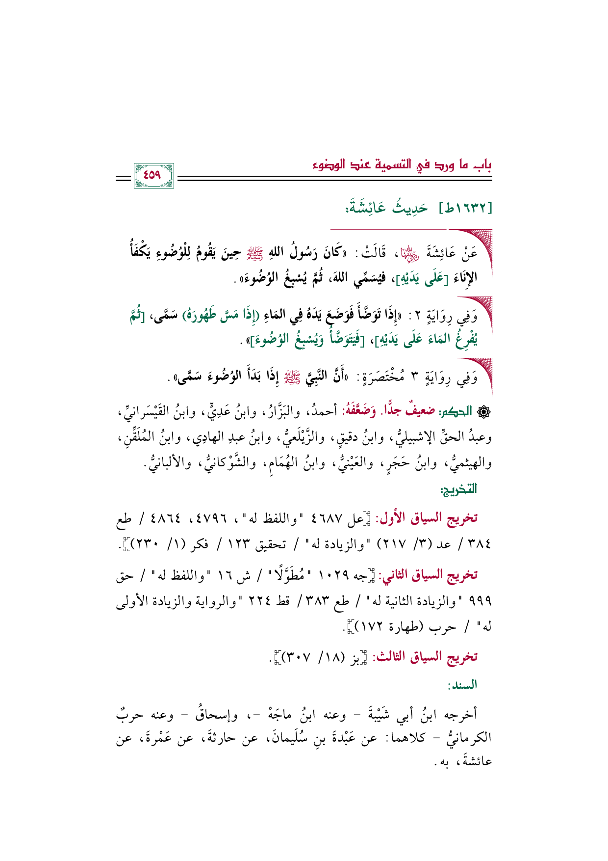 • وَفِي رِوَايَةٍ مُخْتَصَرَةٍ بِلَفْظ: ((أَنَّ النَّبِيَّ صلى الله عليه وسلم إِذَا بَدَأَ الوُضُوءَ سَمَّى)).