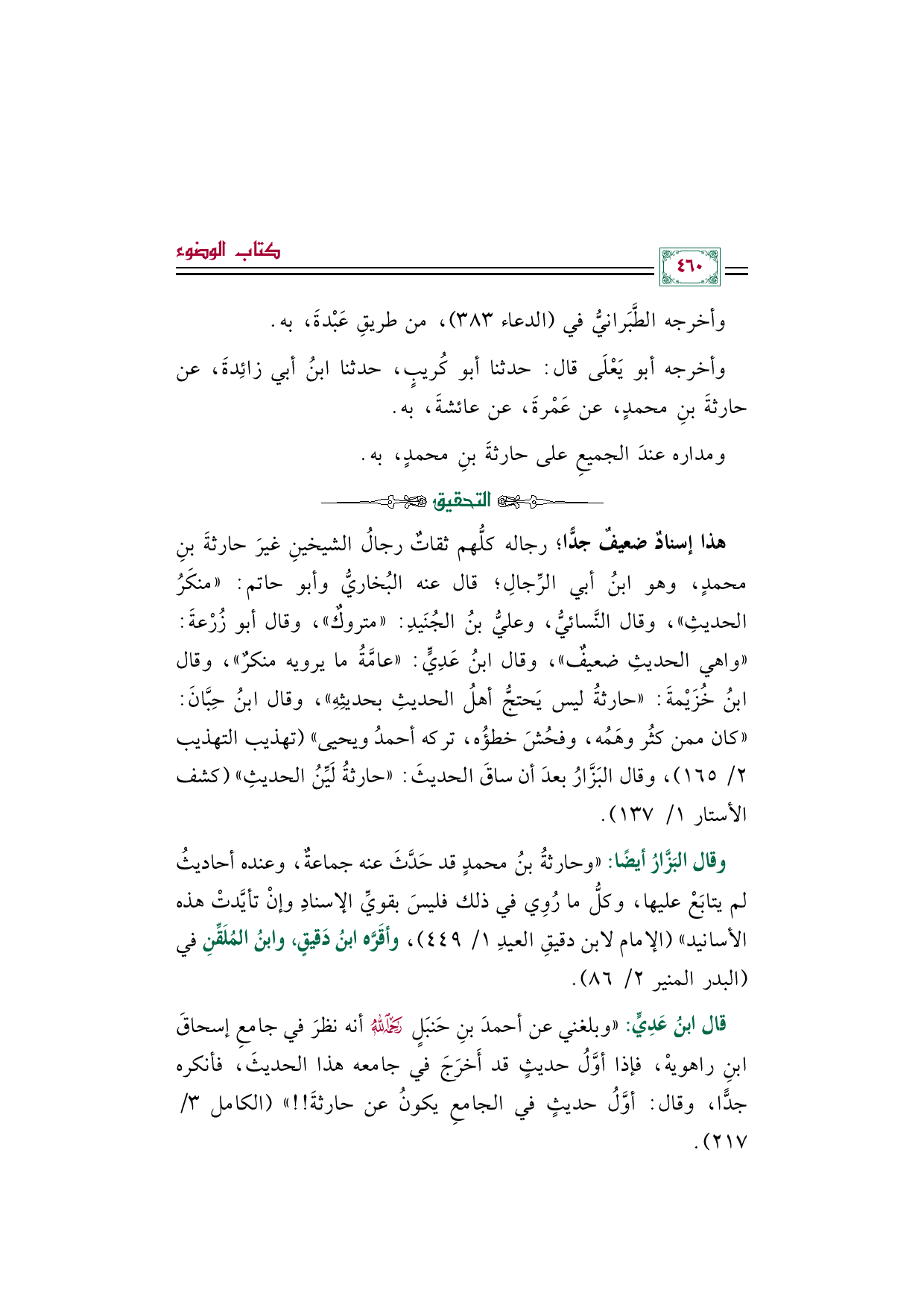 وقال البَزَّارُ أيضًا: "وحارثةُ بنُ محمدٍ قد حَدَّثَ عنه جماعةٌ، وعنده أحاديثُ لم يتابَعْ عليها، وكلُّ ما رُوِي في ذلك فليسَ بقويِّ الإسنادِ وإنْ تأيَّدتْ هذه الأسانيد" (الإمام لابن دقيقِ العيدِ ١/ ٤٤٩)، وأقَرَّه ابنُ دَقيقٍ، وابنُ المُلَقِّنِ في (البدر المنير ٢/ ٨٦).