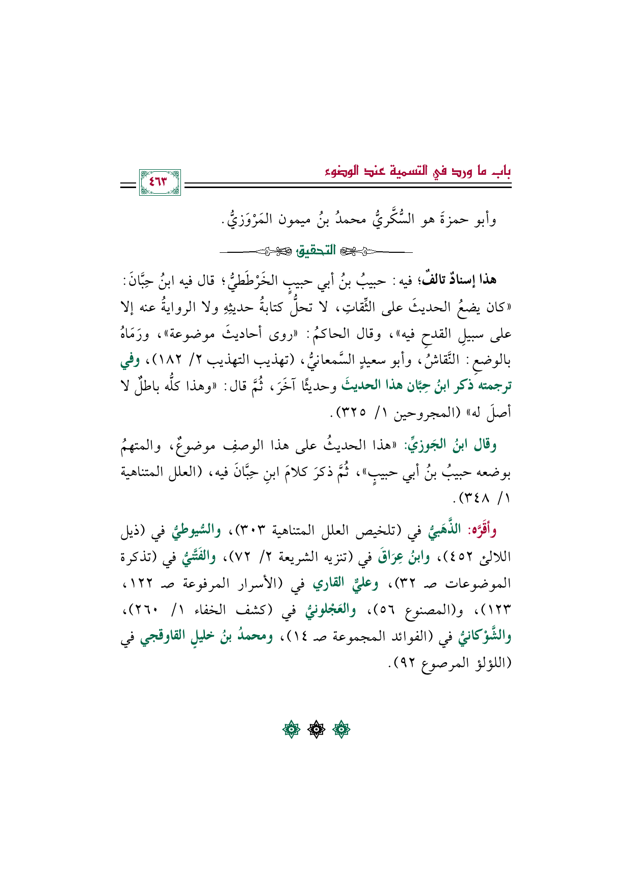 وقال ابنُ الجَوزيِّ: "هذا الحديثُ على هذا الوصفِ موضوعٌ، والمتهمُ بوضعه حبيبُ بنُ أبي حبيبٍ"، ثُمَّ ذكرَ كلامَ ابنِ حِبَّانَ فيه، (العلل المتناهية ١/ ٣٤٨).