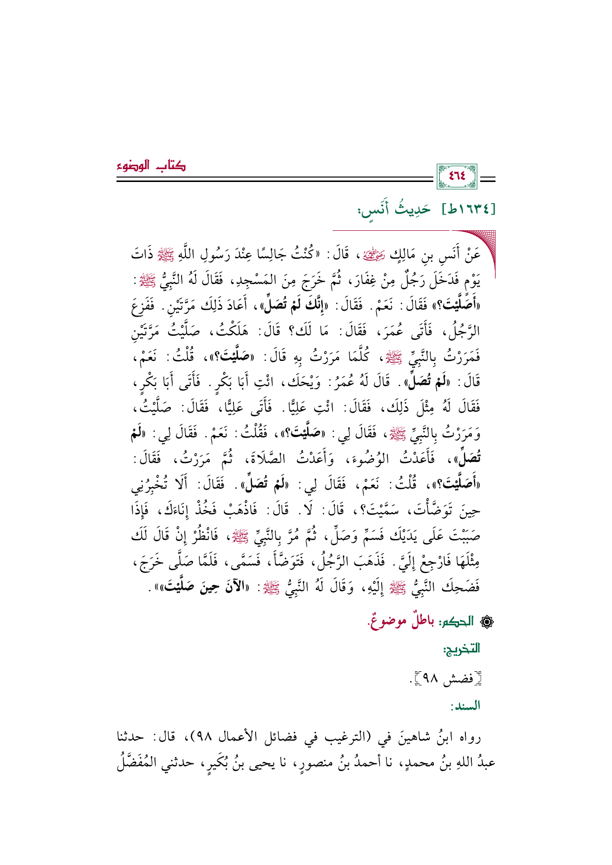 ◼ عَنْ أَنَسِ بنِ مَالِكٍ رضي الله عنه، قَالَ: ((كُنْتُ جَالِسًا عِنْدَ رَسُولِ اللَّهِ صلى الله عليه وسلم ذَاتَ يَوْمٍ فَدَخَلَ رَجُلٌ مِنْ غِفَارَ، ثُمَّ خَرَجَ مِنَ المَسْجِدِ، فَقَالَ لَهُ النَّبِيُّ صلى الله عليه وسلم: «أَصَلَّيْتَ؟ » فَقَالَ: نَعَمْ. فَقَالَ: «إِنَّكَ لَمْ تُصَلِّ»، أَعَادَ ذَلِكَ مَرَّتَيْنِ. فَفَزِعَ الرَّجُلُ، فَأَتَى عُمَرَ، فَقَالَ: مَا لَكَ؟ قَالَ: هَلَكْتُ، صَلَّيْتُ مَرَّتَيْنِ فَمَرَرْتُ بِالنَّبِيِّ صلى الله عليه وسلم، كُلَّمَا مَرَرْتُ بِهِ قَالَ: «صَلَّيْتَ؟ »، قُلْتُ: نَعَمْ، قَالَ: «لَمْ تُصَلِّ». قَالَ لَهُ عُمَرُ: وَيْحَكَ، ائْتِ أَبَا بَكْرٍ. فَأَتَى أَبَا بَكْرٍ، فَقَالَ لَهُ مِثْلَ ذَلِكَ، فَقَالَ: ائْتِ عَلِيًّا. فَأَتَى عَلِيًّا، فَقَالَ: صَلَّيْتُ، وَمَرَرْتُ بِالنَّبِيِّ صلى الله عليه وسلم، فَقَالَ لِي: «صَلَّيْتَ؟ »، فَقُلْتُ: نَعَمْ. فَقَالَ لِي: «لَمْ تُصَلِّ»، فَأَعَدْتُ الوُضُوءَ، وَأَعَدْتُ الصَّلَاةَ، ثُمَّ مَرَرْتُ، فَقَالَ: «أَصَلَّيْتَ؟ »، قُلْتُ: نَعَمْ، فَقَالَ لِي: «لَمْ تُصَلِّ». فَقَالَ: أَلَا تُخْبِرُنِي حِينَ تَوَضَّأْتَ، سَمَّيْتَ؟ ، قَالَ: لَا. قَالَ: فَاذْهَبْ فَخُذْ إِنَاءَكَ، فَإِذَا صَبَبْتَ عَلَى يَدَيْكَ فَسَمِّ وَصَلِّ، ثُمَّ مُرَّ بِالنَّبِيِّ صلى الله عليه وسلم، فَانْظُرْ إِنْ قَالَ لَكَ مِثْلَهَا فَارْجِعْ إِلَيَّ. فَذَهَبَ الرَّجُلُ، فَتَوَضَّأَ، فَسَمَّى، فَلَمَّا صَلَّى خَرَجَ، فَضَحِكَ النَّبِيُّ صلى الله عليه وسلم إِلَيْهِ، وَقَالَ لَهُ النَّبِيُّ صلى الله عليه وسلم: «الآنَ حِينَ صَلَّيْتَ»)).