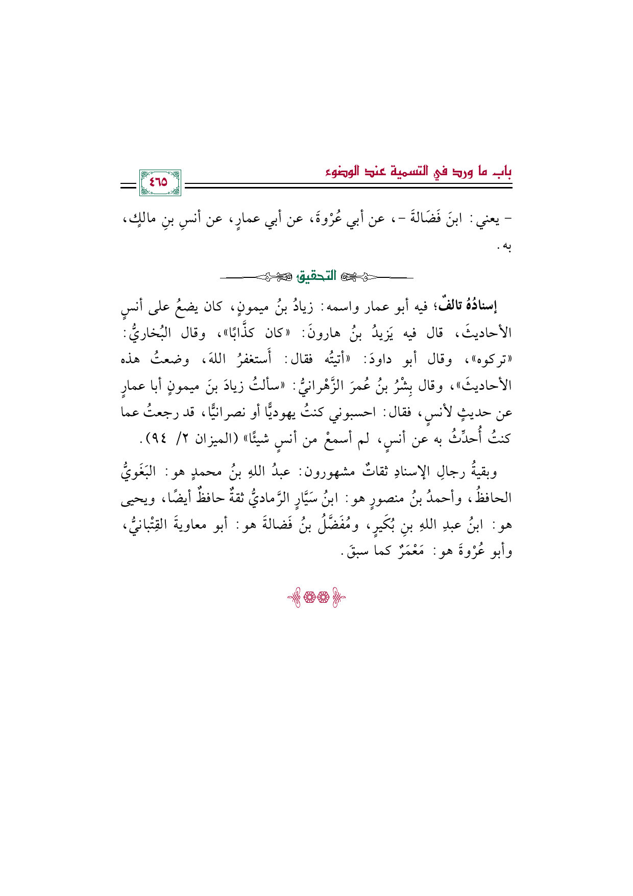 إسنادُهُ تالفٌ؛ فيه أبو عمار واسمه: زيادُ بنُ ميمونٍ، كان يضعُ على أنسٍ الأحاديثَ، قال فيه يَزيدُ بنُ هارونَ: "كان كذَّابًا"، وقال البُخاريُّ: "تركوه"، وقال أبو داودَ: "أتيتُه فقال: أَستغفرُ اللهَ، وضعتُ هذه الأحاديثَ"، وقال بِشْرُ بنُ عُمرَ الزَّهْرانيُّ: "سألتُ زيادَ بنَ ميمونٍ أبا عمارٍ عن حديثٍ لأنسٍ، فقال: احسبوني كنتُ يهوديًّا أو نصرانيًّا، قد رجعتُ عما كنتُ أُحدِّثُ به عن أنسٍ، لم أسمعْ من أنسٍ شيئًا" (الميزان ٢/ ٩٤).