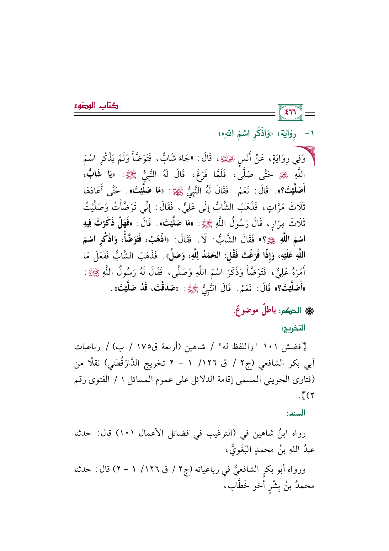 • وَفِي رِوَايَةٍ، عَنْ أَنَسٍ رضي الله عنه، قَالَ: ((جَاءَ شَابٌّ، فَتَوَضَّأَ وَلَمْ يَذْكُرِ اسْمَ اللَّهِ عَزَّ وَجَلَّ حَتَّى صَلَّى، فَلَمَّا فَرَغَ، قَالَ لَهُ النَّبِيُّ صلى الله عليه وسلم: «يَا شَابُّ، أَصَلَّيْتَ؟». قَالَ: نَعَمْ. فَقَالَ لَهُ النَّبِيُّ صلى الله عليه وسلم: «مَا صَلَّيْتَ». حَتَّى أَعَادَهَا ثَلَاثَ مَرَّاتٍ، فَذَهَبَ الشَّابُّ إِلَى عَلِيٍّ، فَقَالَ: إِنِّي تَوَضَّأْتُ وَصَلَّيْتُ ثَلَاثَ مِرَارٍ، قَالَ رَسُولُ اللَّهِ صلى الله عليه وسلم: «مَا صَلَّيْتَ». قَالَ: «فَهَلْ ذَكَرْتَ فِيهِ اسْمَ اللَّهِ عَزَّ وَجَلَّ؟» فَقَالَ الشَّابُّ: لَا. فَقَالَ: «اذْهَبْ، فَتَوَضَّأْ، وَاذْكُرِ اسْمَ اللَّهِ عَلَيْهِ، وَإِذْا فَرَغْتَ فَقُلِ: الحَمْدُ لِلَّهِ، وَصَلِّ». فَذَهَبَ الشَّابُّ فَفَعَلَ مَا أَمَرَهُ عَلِيٌّ، فَتَوَضَّأَ وَذَكَرَ اسْمَ اللَّهِ وَصَلَّى، فَقَالَ لَهُ رَسُولُ اللَّهِ صلى الله عليه وسلم: «أَصَلَّيْتَ؟» قَالَ: نَعَمْ. قَالَ النَّبِيُّ صلى الله عليه وسلم: «صَدَقْتَ، قَدْ صَلَّيْتَ».