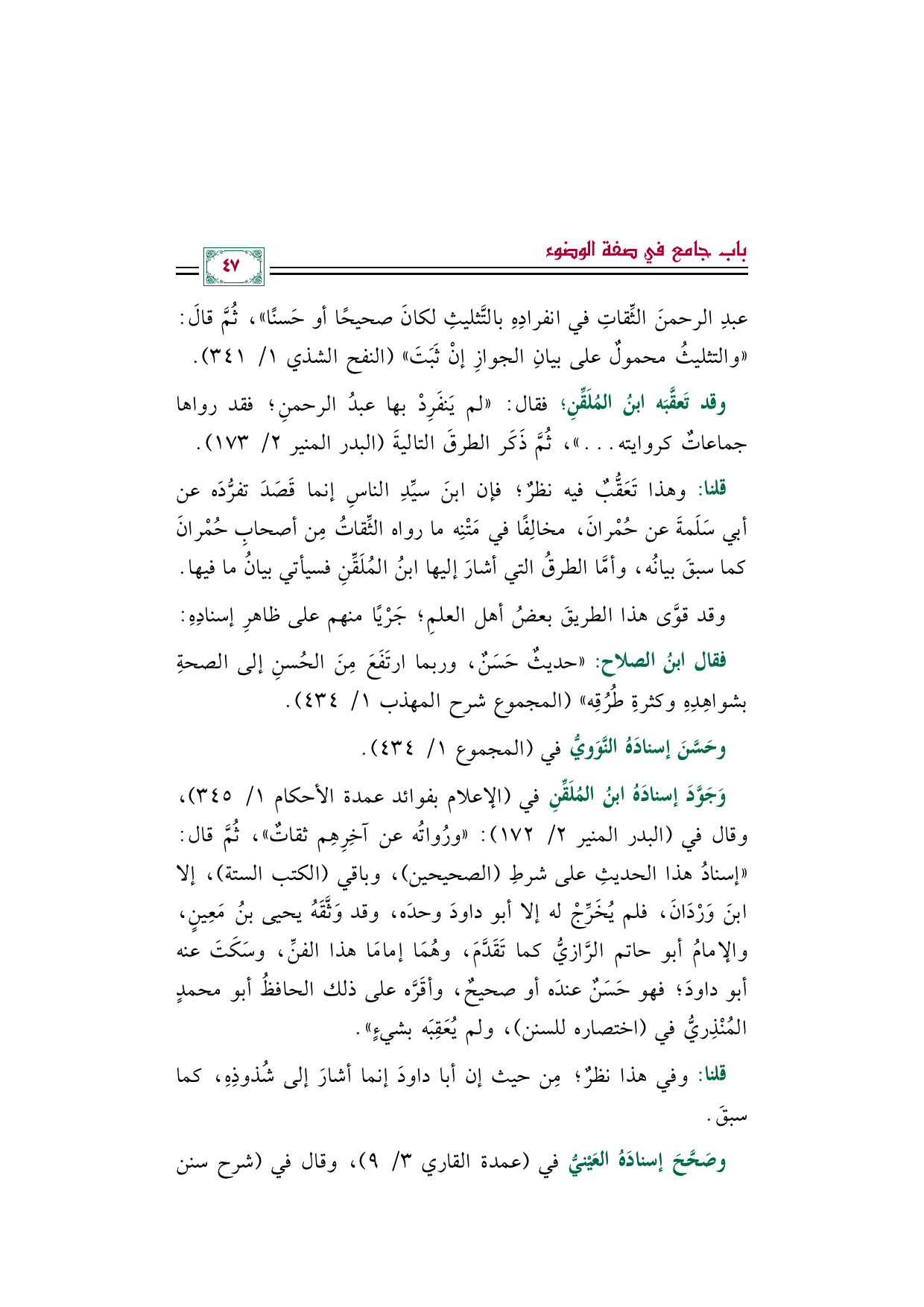 قلنا: وهذا تَعَقُّبٌ فيه نظرٌ؛ فإن ابنَ سيِّدِ الناسِ إنما قَصَدَ تفرُّدَه عن أبي سَلَمةَ عن حُمْرانَ، مخالِفًا في مَتْنِه ما رواه الثِّقاتُ مِن أصحابِ حُمْرانَ كما سبقَ بيانُه، وأمَّا الطرقُ التي أشارَ إليها ابنُ المُلَقِّنِ فسيأتي بيانُ ما فيها.