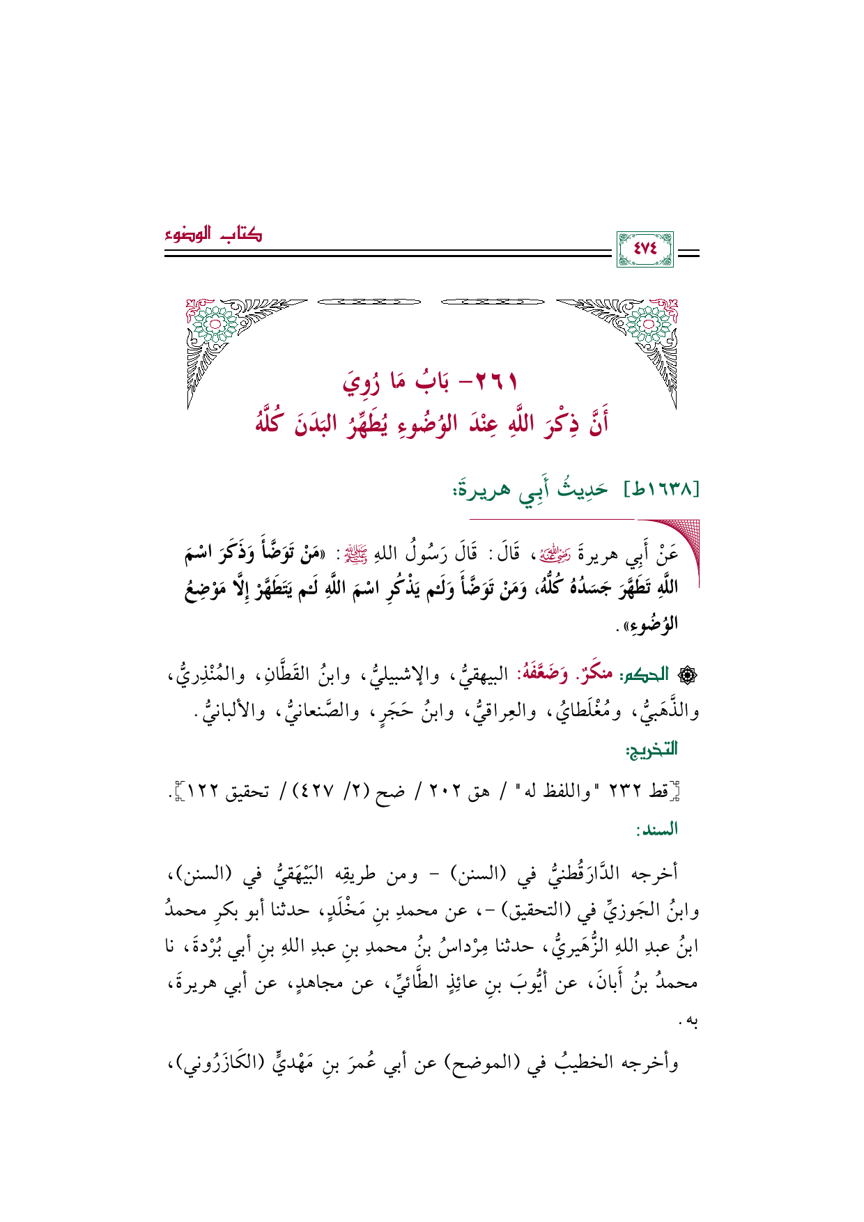 أخرجه الدَّارَقُطنيُّ في (السنن) -ومن طريقِه البَيْهَقيُّ في (السنن)، وابنُ الجَوزيِّ في (التحقيق) -، عن محمدِ بنِ مَخْلَدٍ، حدثنا أبو بكرِ محمدُ بنُ عبدِ اللهِ الزُّهَيريُّ، حدثنا مِرْداسُ بنُ محمدِ بنِ عبدِ اللهِ بنِ أبي بُرْدةَ، نا محمدُ بنُ أَبانَ، عن أيُّوبَ بنِ عائِذٍ الطَّائيِّ، عن مجاهدٍ، عن أبي هريرةَ، به.