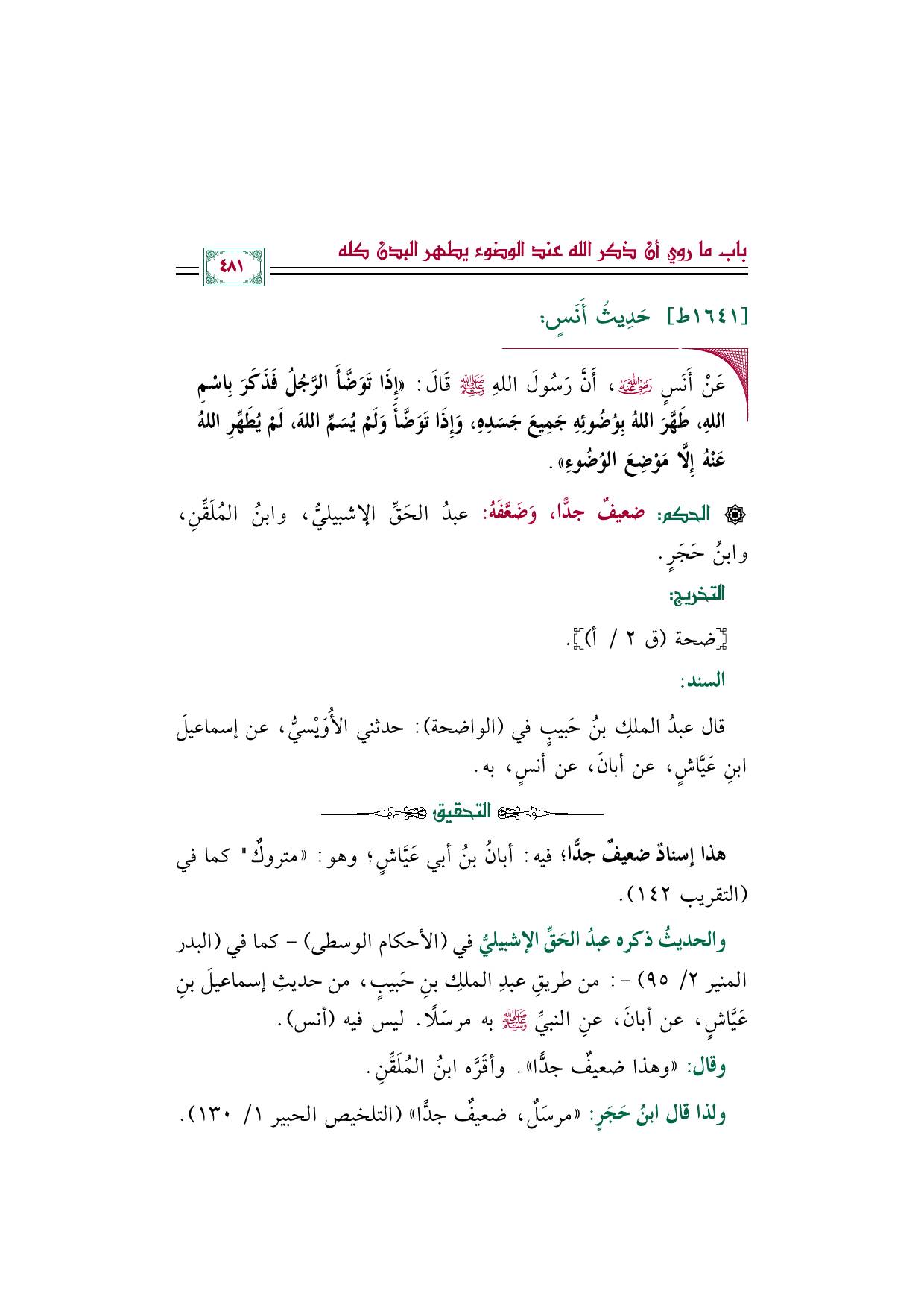 والحديثُ ذكره عبدُ الحَقِّ الإشبيليُّ في (الأحكام الوسطى) -كما في (البدر المنير ٢/ ٩٥) -: من طريقِ عبدِ الملكِ بنِ حَبيبٍ، من حديثِ إسماعيلَ بنِ عَيَّاشٍ، عن أبانَ، عنِ النبيِّ صلى الله عليه وسلم به مرسَلًا. ليس فيه (أنس).
