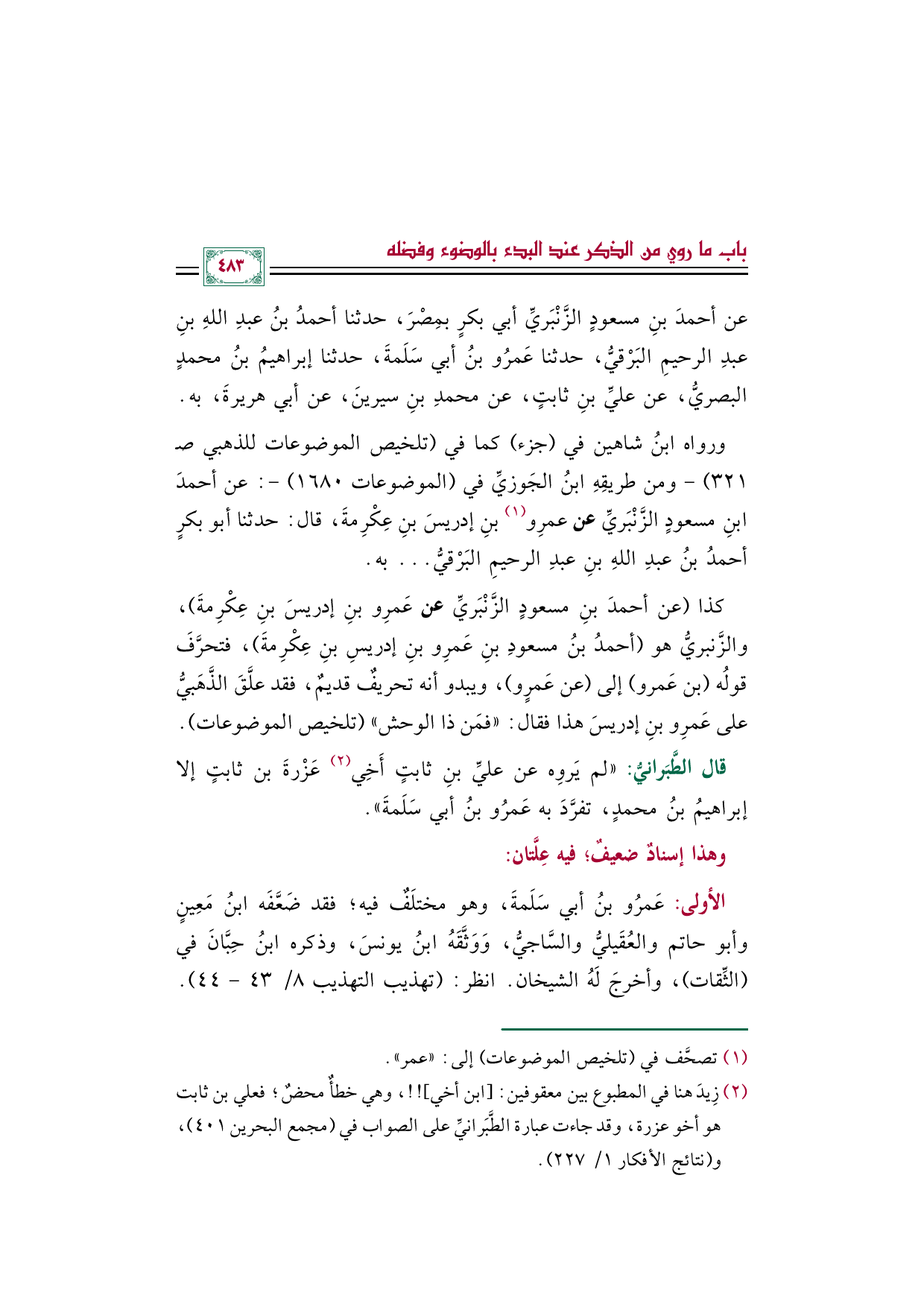 كذا (عن أحمدَ بنِ مسعودٍ الزَّنْبَريِّ عن عَمرِو بنِ إدريسَ بنِ عِكْرِمةَ)، والزَّنبريُّ هو (أحمدُ بنُ مسعودِ بنِ عَمرِو بنِ إدريسِ بنِ عِكْرِمةَ)، فتحرَّفَ قولُه (بن عَمرو) إلى (عن عَمرٍو)، ويبدو أنه تحريفٌ قديمٌ، فقد علَّقَ الذَّهَبيُّ على عَمرِو بنِ إدريسَ هذا فقال: "فمَن ذا الوحش" (تلخيص الموضوعات).
