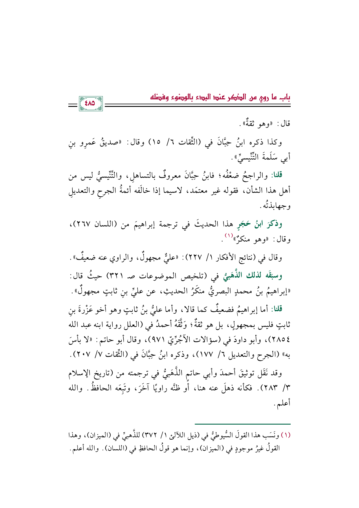 قلنا: والراجحُ ضعْفُه؛ فابنُ حِبَّانَ معروفٌ بالتساهلِ، والتِّنِّيسيُّ ليس من أهل هذا الشأن، فقوله غير معتمَد، لاسيما إذا خالَفه أئمةُ الجرحِ والتعديلِ وجهابذتُه.