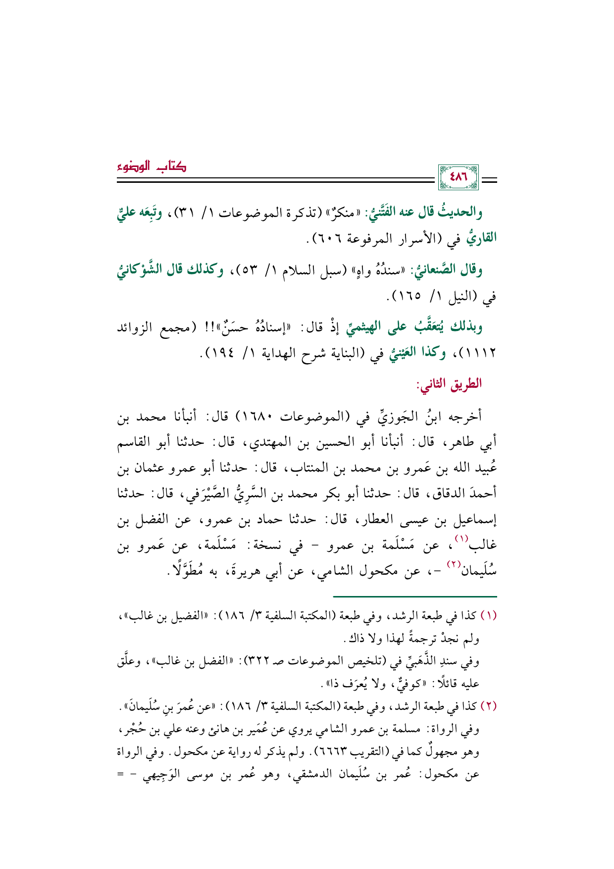 (¬٢) كذا في طبعة الرشد، وفي طبعة (المكتبة السلفية ٣/ ١٨٦): "عن عُمرَ بنِ سُلَيمانَ". وفي الرواة: مسلمة بن عمرو الشامي يروي عن عُمَير بن هانئ وعنه علي بن حُجْر، وهو مجهولٌ كما في (التقريب ٦٦٦٣). ولم يذكر له رواية عن مكحول. وفي الرواة عن مكحول: عُمر بن سُلَيمان الدمشقي، وهو عُمر بن موسى الوَجِيهي -على التحقيق-، وهو ساقطٌ.