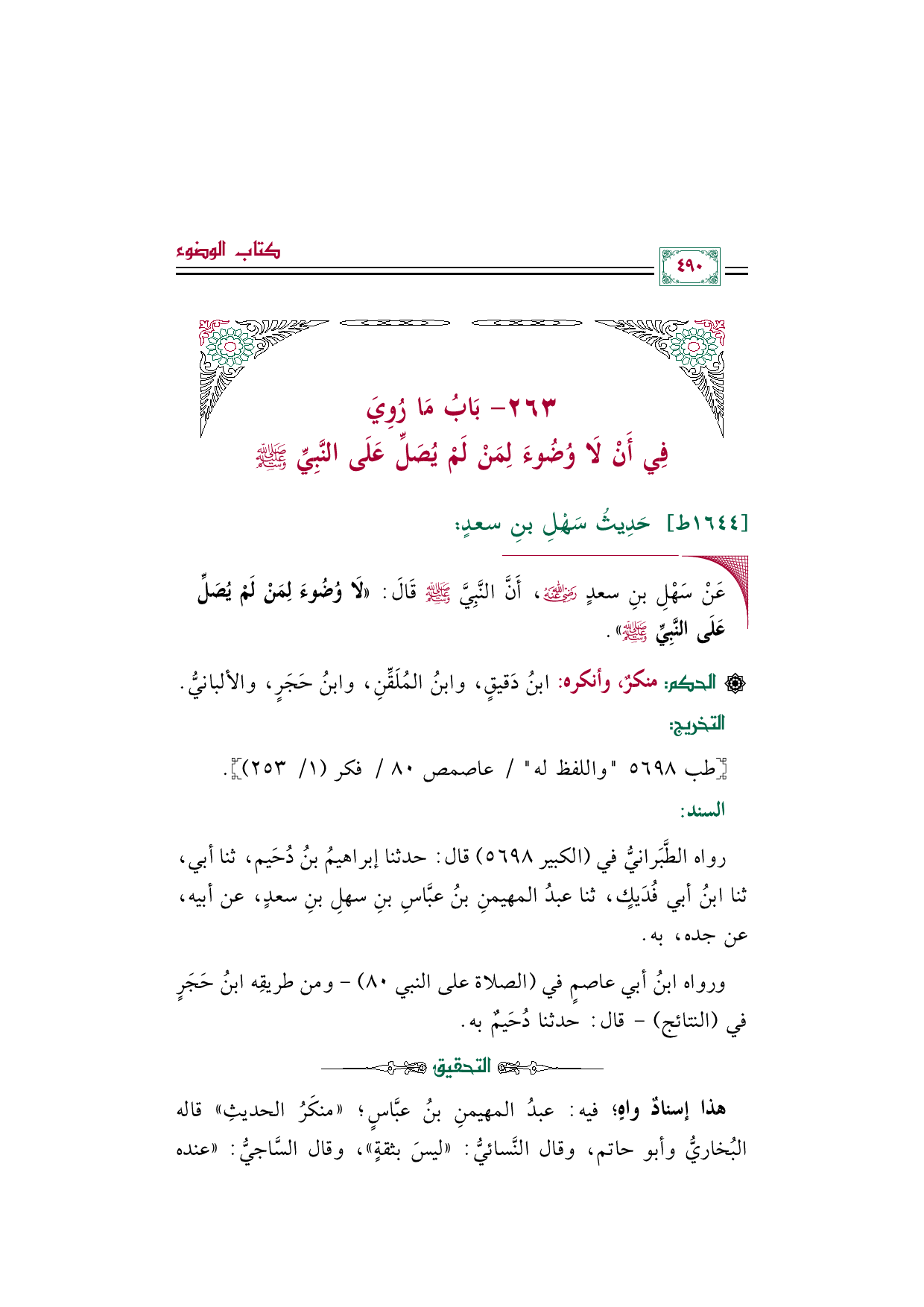 ◼ عَنْ سَهْلِ بنِ سعدٍ رضي الله عنه، أَنَّ النَّبِيَّ صلى الله عليه وسلم قَالَ: «لَا وُضُوءَ لِمَنْ لَمْ يُصَلِّ عَلَى النَّبِيِّ صلى الله عليه وسلم».