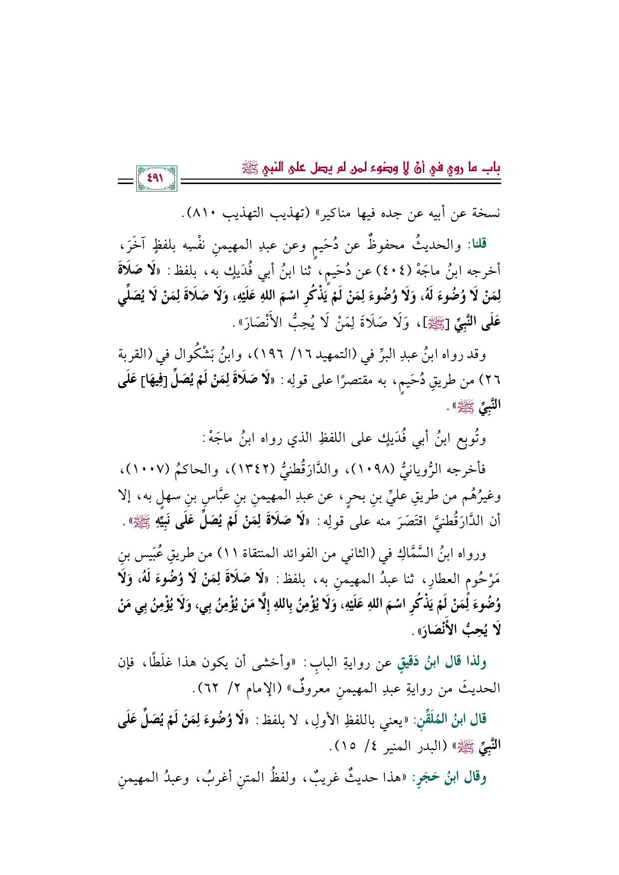 قلنا: والحديثُ محفوظٌ عن دُحَيمٍ وعن عبدِ المهيمنِ نفْسِه بلفظٍ آخَرَ، أخرجه ابنُ ماجَهْ (٤٠٤) عن دُحَيمٍ، ثنا ابنُ أبي فُدَيكٍ به، بلفظ: «لَا صَلَاةَ لِمَنْ لَا وُضُوءَ لَهُ، وَلَا وُضُوءَ لِمَنْ لَمْ يَذْكُرِ اسْمَ اللهِ عَلَيْهِ، وَلَا صَلَاةَ لِمَنْ لَا يُصَلِّي عَلَى النَّبِيِّ [صلى الله عليه وسلم]، وَلَا صَلَاةَ لِمَنْ لَا يُحِبُّ الأَنْصَارَ».