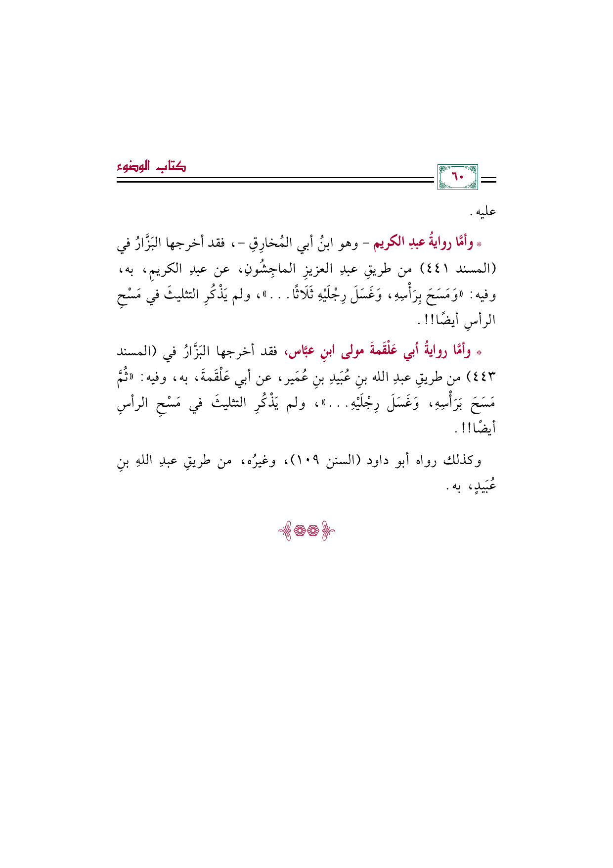 * وأمَّا روايةُ أبي عَلْقَمةَ مولى ابنِ عبَّاس، فقد أخرجها البَزَّارُ في (المسند ٤٤٣) من طريقِ عبدِ الله بنِ عُبَيدِ بنِ عُمَير، عن أبي عَلْقَمةَ، به، وفيه: ((ثُمَّ مَسَحَ بَرَأْسِهِ، وَغَسَلَ رِجْلَيْهِ ... ))، ولم يَذْكُرِ التثليثَ في مَسْحِ الرأسِ أيضًا! ! .