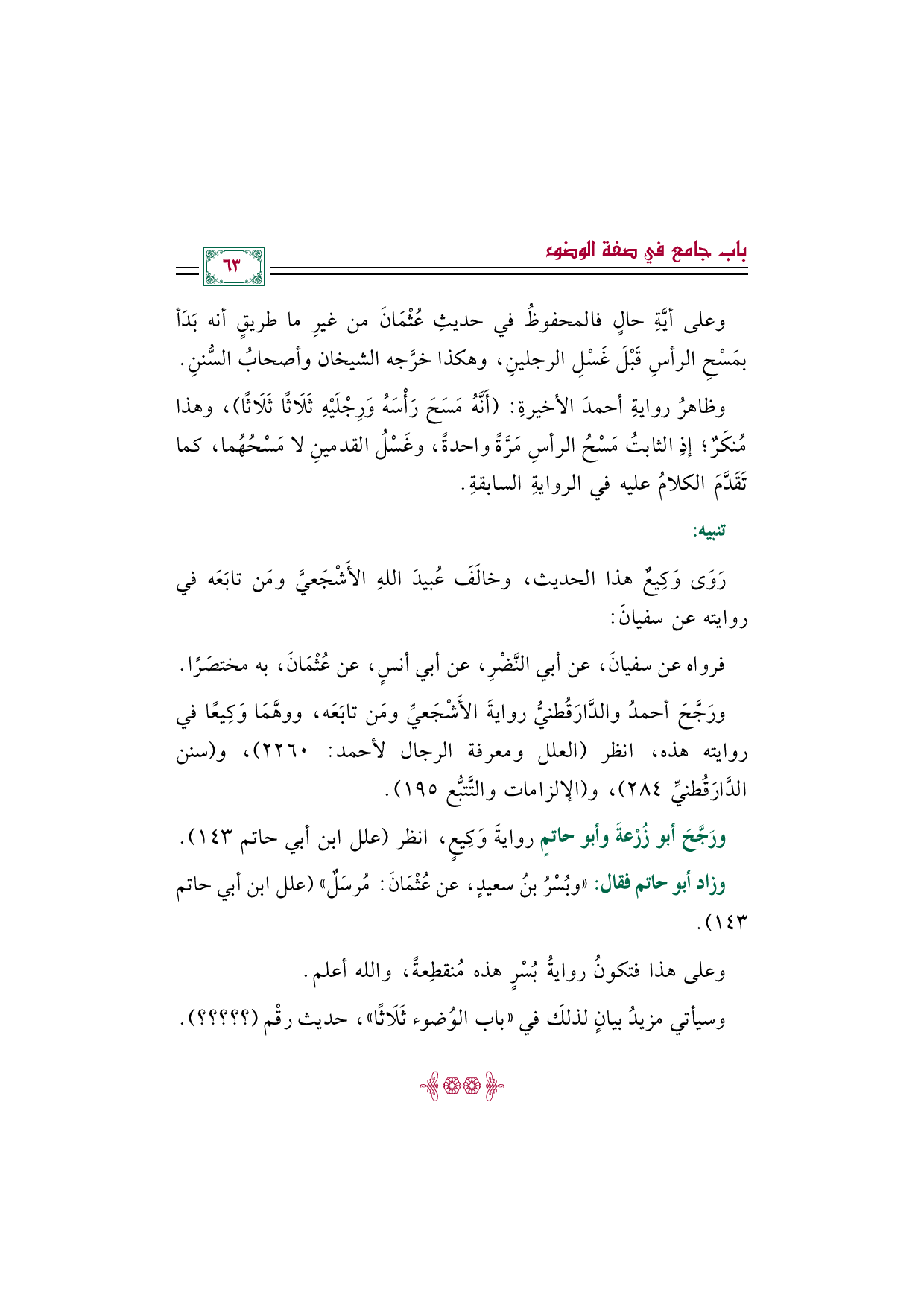 وزاد أبو حاتم فقال: "وبُسْرُ بنُ سعيدٍ، عن عُثْمَانَ: مُرسَلٌ" (علل ابن أبي حاتم ١٤٣).