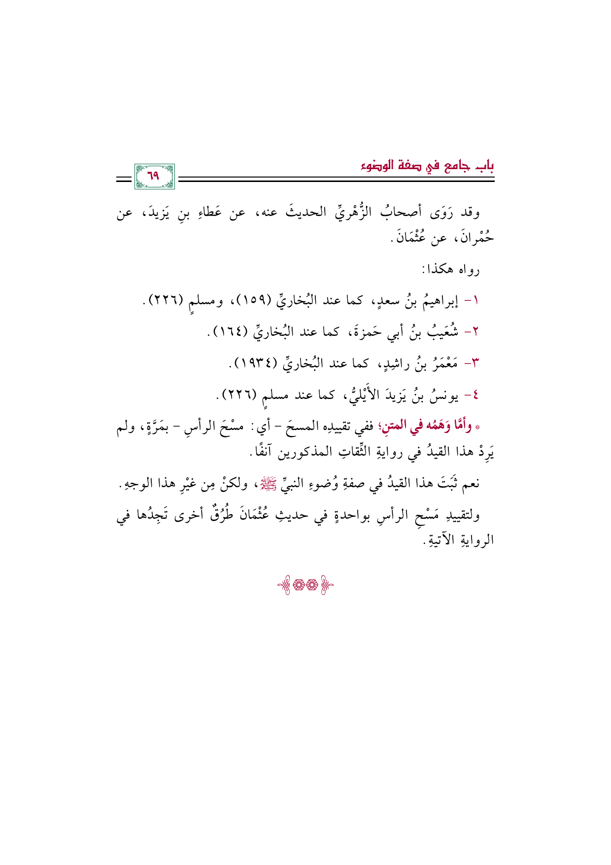* وأمَّا وَهَمُه في المتنِ؛ ففي تقييدِه المسحَ -أي: مسْحَ الرأسِ- بمَرَّةٍ، ولم يَرِدْ هذا القيدُ في روايةِ الثِّقاتِ المذكورين آنفًا.