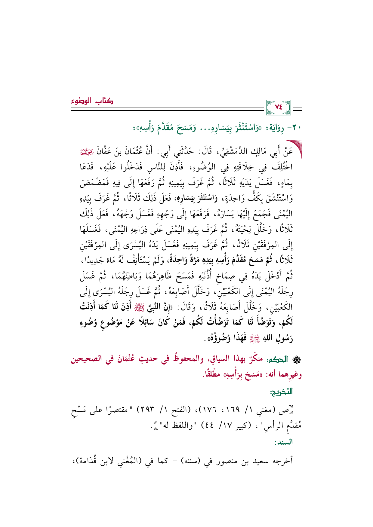 • عَنْ أَبِي مَالِكٍ الدِّمَشْقِيِّ، قَالَ: حَدَّثَنِي أَبِي: أَنَّ عُثْمَانَ بنَ عَفَّانَ رضي الله عنه اخْتُلِفَ فِي خِلَافَتِهِ فِي الوُضُوءِ، فَأَذِنَ لِلنَّاسِ فَدَخَلُوا عَلَيْهِ، فَدَعَا بِمَاءٍ، فَغَسَلَ يَدَيْهِ ثَلَاثًا، ثُمَّ غَرَفَ بِيَمِينِهِ ثُمَّ رَفَعَهَا إِلَى فِيهِ فَمَضْمَضَ وَاسْتَنْشَقَ بِكَفٍّ وَاحِدَةٍ، وَاسْتَنْثَرَ بِيَسَارِهِ، فَعَلَ ذَلِكَ ثَلَاثًا، ثُمَّ غَرَفَ بِيَدِهِ اليُمْنَى فَجَمَعَ إِلَيْهَا يَسَارَهُ، فَرَفَعَهَا إِلَى وَجْهِهِ فَغَسَلَ وَجْهَهُ، فَعَلَ ذَلِكَ ثَلَاثًا، وَخَلَّلَ لِحْيَتَهُ، ثُمَّ غَرَفَ بِيَدِهِ اليُمْنَى عَلَى ذِرَاعِهِ اليُمْنَى، فَغَسَلَهَا إِلَى المِرْفَقَيْنِ ثَلَاثًا، ثُمَّ غَرَفَ بِيَمِينِهِ فَغَسَلَ يَدَهُ اليُسْرَى إِلَى المِرْفَقَيْنِ ثَلَاثًا، ثُمَّ مَسَحَ مُقَدَّمَ رَأْسِهِ بِيَدِهِ مَرَّةً وَاحِدَةً، وَلَمْ يَسْتَأْنِفْ لَهُ مَاءً جَدِيدًا، ثُمَّ أَدْخَلَ يَدَهُ فِي صِمَاخِ أُذُنَيْهِ فَمَسَحَ ظَاهِرَهُمَا وَبَاطِنَهُمَا، ثُمَّ غَسَلَ رِجْلَهُ اليُمْنَى إِلَى الكَعْبَيْنِ، وَخَلَّلَ أَصَابِعَهُ، ثُمَّ غَسَلَ رِجْلَهُ اليُسْرَى إِلَى الكَعْبَيْنِ، وَخَلَّلَ أَصَابِعَهُ ثَلَاثًا، وَقَالَ: ((إِنَّ النَّبِيَّ صلى الله عليه وسلم أَذِنَ لَنَا كَمَا أَذِنْتُ لَكُمْ، وَتَوَضَّأَ لَنَا كَمَا تَوَضَّأْتُ لَكُمْ، فَمَنْ كَانَ سَائِلًا عَنْ مَوْضُوعِ وُضُوءِ رَسُولِ اللهِ صلى الله عليه وسلم فَهَذَا وُضُوؤُهُ)).