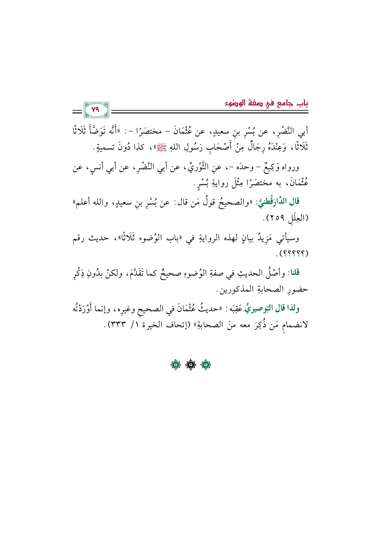 ولذا قال البُوصيريُّ عَقِبَه: "حديثُ عُثْمَانَ في الصحيحِ وغيرِه، وإنما أَوْرَدْتُه لانضمامِ مَن ذُكِرَ معه منَ الصحابةِ" (إتحاف الخيرة ١/ ٣٣٣).