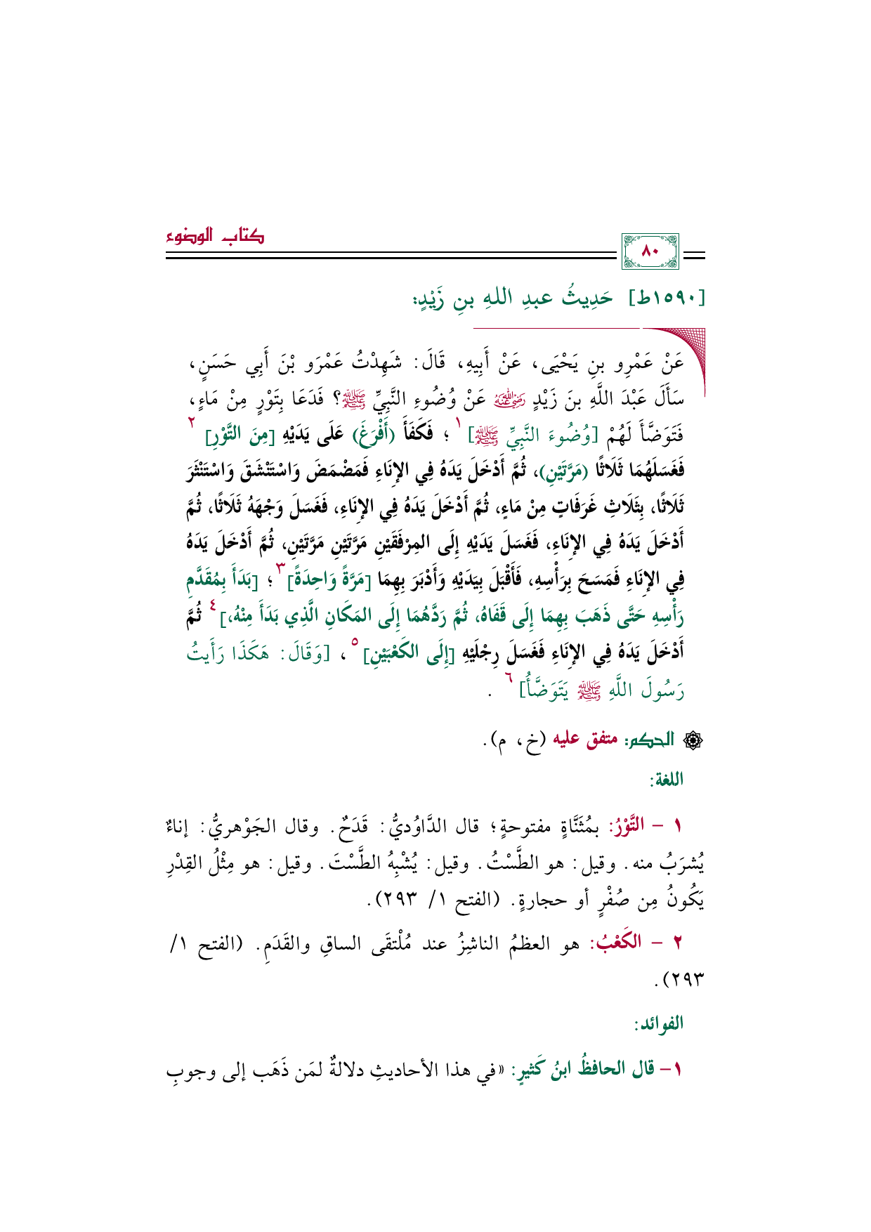 ◼ عَنْ عَمْرِو بنِ يَحْيَى، عَنْ أَبِيهِ، قَالَ: شَهِدْتُ عَمْرَو بْنَ أَبِي حَسَنٍ، سَأَلَ عَبْدَ اللَّهِ بنَ زَيْدٍ رضي الله عنه عَنْ وُضُوءِ النَّبِيِّ صلى الله عليه وسلم؟ فَدَعَا بِتَوْرٍ مِنْ مَاءٍ، فَتَوَضَّأَ لَهُمْ [وُضُوءَ النَّبِيِّ صلى الله عليه وسلم] ١؛ فَكَفَأَ (أَفْرَغَ) عَلَى يَدَيْهِ [مِنَ التَّوْرِ] ٢ فَغَسَلَهُمَا ثَلَاثًا (مَرَّتَيْنِ)، ثُمَّ أَدْخَلَ يَدَهُ فِي الإِنَاءِ فَمَضْمَضَ وَاسْتَنْشَقَ وَاسْتَنْثَرَ ثَلَاثًا، بِثَلَاثِ غَرَفَاتٍ مِنْ مَاءٍ، ثُمَّ أَدْخَلَ يَدَهُ فِي الإِنَاءِ، فَغَسَلَ وَجْهَهُ ثَلَاثًا، ثُمَّ أَدْخَلَ يَدَهُ فِي الإِنَاءِ، فَغَسَلَ يَدَيْهِ إِلَى المِرْفَقَيْنِ مَرَّتَيْنِ مَرَّتَيْنِ، ثُمَّ أَدْخَلَ يَدَهُ فِي الإِنَاءِ فَمَسَحَ بِرَأْسِهِ، فَأَقْبَلَ بِيَدَيْهِ وَأَدْبَرَ بِهِمَا [مَرَّةً وَاحِدَةً] ٣؛ [بَدَأَ بِمُقَدَّمِ رَأْسِهِ حَتَّى ذَهَبَ بِهِمَا إِلَى قَفَاهُ، ثُمَّ رَدَّهُمَا إِلَى المَكَانِ الَّذِي بَدَأَ مِنْهُ، ] ٤ ثُمَّ أَدْخَلَ يَدَهُ فِي الإِنَاءِ فَغَسَلَ رِجْلَيْهِ [إِلَى الكَعْبَيْنِ] ٥، [وَقَالَ: هَكَذَا رَأَيتُ رَسُولَ اللَّهِ صلى الله عليه وسلم يَتَوَضَّأُ] ٦.