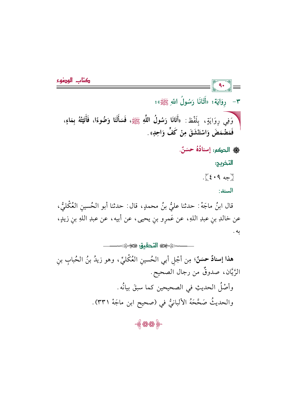 قال ابنُ ماجَهْ: حدثنا عليُّ بنُ محمدٍ، قال: حدثنا أبو الحُسينِ العُكْليُّ، عن خالدِ بنِ عبدِ اللهِ، عن عَمرِو بنِ يحيى، عن أبيه، عن عبدِ اللهِ بنِ زيدٍ، به.