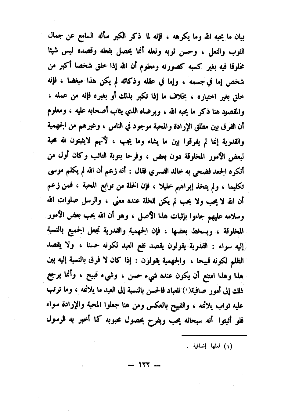 ومعلوم أن الله إذا خلق شخصا أكبر من شخص إما في جسمه، وإما في عقله وذكائه لم يكن هذا مبغضا؛ فإنه خلق بغير اختياره، بخلاف ما إذا تكبر بذلك أو بغيره فإنه من عمله، والمقصود هنا ذكر ما يحبه الله ويرضاه الذي يثاب أصحابه عليه، ومعلوم أن الفرق بين مطلق الإرادة والمحبة موجود في الناس، وغيرهم من الجهمية والقدرية إنما لم يفرقوا بين ما يشاء وما يحب، لأنهم لا يثبتون لله محبة لبعض الأمور المخلوقة دون بعض، وفرحا بتوبة التائب. وكان أول من أنكره الجعد فضحى به خالد القسري فقال: إنه زعم أن الله لم يكلم موسى تكليما، ولم يتخذ إبراهيم خليلا. فإن الخلة من توابع المحبة، فمن زعم أن الله لا يحب ولا يحب لم يكن للخلة عنده معنى. والرسل صلوات الله وسلامه عليهم جاؤوا بإثبات هذا الأصل، وهو أن الله يحب بعض الأمور المخلوقة، ويسخط بعضها، فإن الجهمية والقدرية تجعل الجميع بالنسبة إليه سواء، القدرية يقولون يقصد نفع العبد لكونه حسنا، ولا يقصد الظلم لكونه قبيحا.