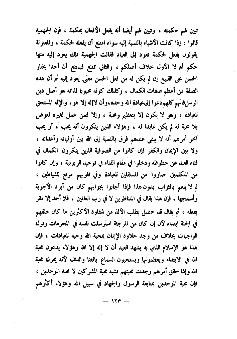 وهؤلاء الذين ينكرون أنه يحب أو يحب، آخر أمرهم أنه لا يبقى عندهم فرق بالنسبة إلى الله بين أوليائه وأعدائه، ولا بين الإيمان والكفر. فإن كانوا من الصوفية الذين ينكرون الكمال في فناء العبد عن حظوظه، ودخلوا في مقام الفناء في توحيد الربوبية، وإن كانوا من المتكلمين صاروا من المستقلين للعبادة وفي قلوبهم مرتع للشياطين، لم لا ينعم بالثواب بدون هذا؟ فإذا أجابوا بجوابهم كان من أبرد الأجوبة وأسمجها، فإن هذا يقال في المتناظرين لا في رب العالمين، فلا أحد إلا مقر بفعله، ثم يقال قد حصل بطلب الألذ من شقاوة الأكثرين ما كان خلقهم في الجنة ابتداء، لأنه إن كان من المرجئة استرسلت نفسه في المحرمات وترك الواجبات، بخلاف من وجد حلاوة الإيمان بمحبة الله وحبه للعبادات، فإن هذا هو الإسلام الذي به يشهد العبد أن لا إله إلا الله. وهؤلاء يدعون محبة الله في الابتداء ويعظمونها ويستحبون السماع بالغنا والدف لأنه يحرك محبة الله، وإذا حقق أمرهم وجدت محبتهم تشبه محبة المشركين لا محبة الموحدين. فإن محبة الموحدين بمتابعة الرسول والجهاد في سبيل الله، وهؤلاء أكثرهم