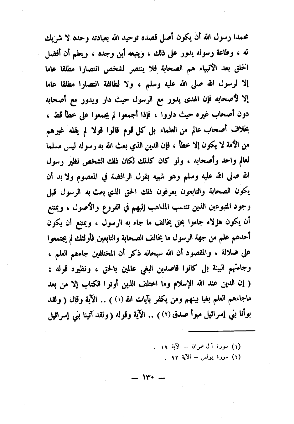 فإن الهدى يدور مع الرسول حيث دار، ويدور مع أصحابه دون أصحاب غيره حيث داروا؛ فإذا أجمعوا لم يجمعوا على خطأ قط، بخلاف أصحاب عالم من العلماء، بل كل قوم قالوا قولا لم يقله غيرهم من الأمة لا يكون إلا خطأ. فإن الدين الذي بعث الله به رسوله ليس مسلما لعالم واحد وأصحابه، ولو كان كذلك لكان ذلك الشخص نظير رسول الله صلى الله عليه وسلم وهو شبيه بقول الرافضة في المعصوم، ولا بد أن يكون الصحابة والتابعون يعرفون ذلك الحق الذي بعث به الرسول قبل وجود المتبوعين الذين تنتسب المذاهب إليهم في الفروع والأصول، ويمتنع أن يكون هؤلاء جاؤوا بحق يخالف ما جاء به الرسول، ويمتنع أن يكون أحدهم علم من جهة الرسول ما يخالف الصحابة والتابعين، فأولئك لم يجتمعوا على ضلالة. والمقصود أن الله سبحانه ذكر أن المختلفين جاءهم العلم، وجاءتهم البينة بل كانوا قاصدين البغي عالمين بالحق، ونظيره قوله: {إِنَّ الدِّينَ عِنْدَ اللَّهِ الْأِسْلامُ وَمَا اخْتَلَفَ الَّذِينَ أُوتُوا الْكِتَابَ إِلَّا مِنْ بَعْدِ مَا جَاءَهُمُ الْعِلْمُ بَغْياً بَيْنَهُمْ وَمَنْ يَكْفُرْ بِآيَاتِ اللَّهِ} 1 الآية. وقال: {وَلَقَدْ بَوَّأْنَا بَنِي إِسْرائيلَ مُبَوَّأَ صِدْقٍ} 2 الآية. وقوله: {وَلَقَدْ آتَيْنَا بَنِي إِسْرائيلَ
