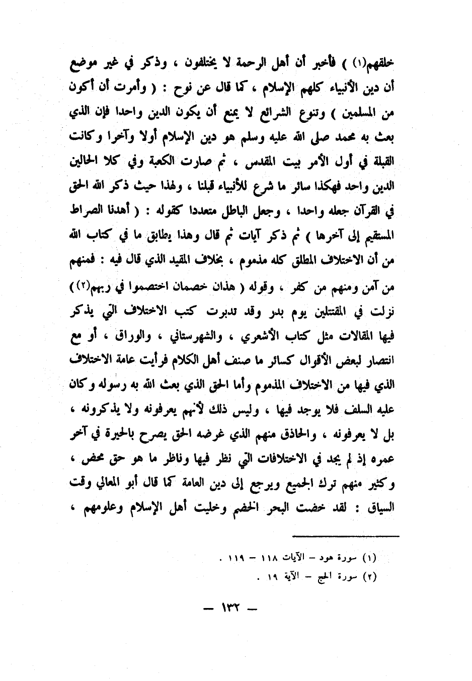 ولهذا حيث ذكر الله الحق في القرآن جعله واحدا، وجعل الباطل متعددا كقوله: {اهْدِنَا الصِّرَاطَ الْمُسْتَقِيمَ} 3 إلى آخرها. ثم ذكر آيات ثم قال: وهذا يطابق ما في كتاب الله من أن الاختلاف المطلق كله مذموم، بخلاف المقيد الذي قال فيه: {فَمِنْهُمْ مَنْ آمَنَ وَمِنْهُمْ مَنْ كَفَرَ} 4، وقوله: {هَذَانِ خَصْمَانِ اخْتَصَمُوا فِي رَبِّهِمْ} 5 نزلت في المقتتلين يوم بدر. وقد تدبرت كتب الاختلاف التي يذكر فيها المقالات مثل كتاب الأشعري والشهرستاني والوراق، أو مع انتصار لبعض الأقوال كسائر ما صنف أهل الكلام، فرأيت عامة الاختلاف الذي فيها من الاختلاف المذموم، وأما الحق الذي بعث الله به رسوله وكان عليه السلف فلا يوجد فيها، وليس ذلك لأنهم يعرفونه ولا يذكرونه، بل لا يعرفونه، والحاذق منهم الذي غرضه الحق يصرح بالحيرة في آخر عمره إذ لم يجد في الاختلافات التي نظر فيها وناظر ما هو حق محض. وكثير منهم ترك الجميع، ويرجع إلى دين العامة كما قال أبو المعالي وقت السياق: لقد خضت البحر الخضم، وخليت أهل الإسلام وعلومهم،