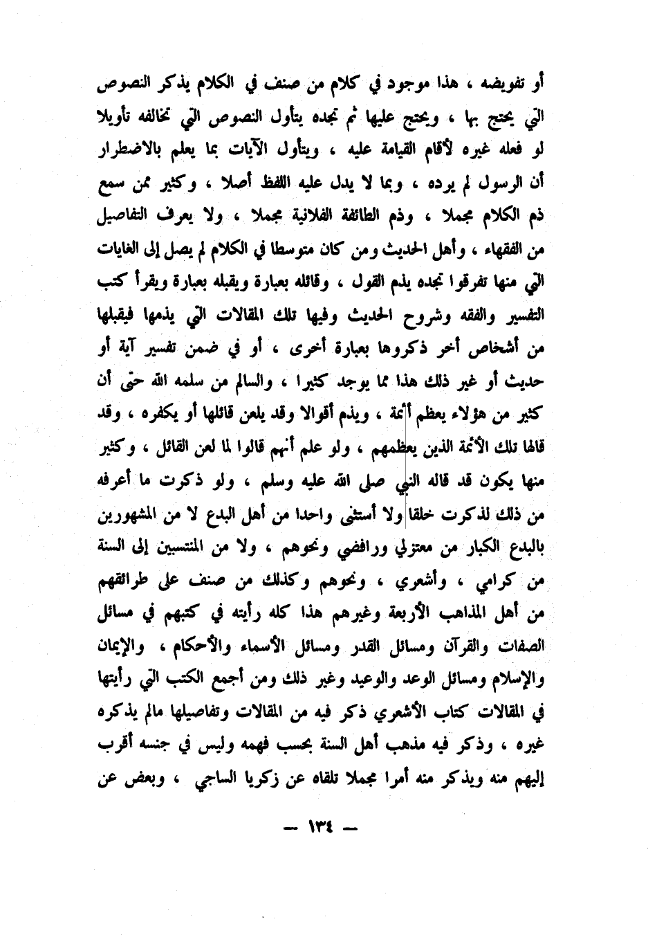 أو تفويضه. هذا موجود في كلام من صنف في الكلام يذكر النصوص التي يحتج بها، ويحتج عليها، ثم تجده يتأول النصوص التي تخالفه تأويلا لو فعله غيره لأقام القيامة عليه. ويتأول الآيات بما يعلم بالاضطرار أن الرسول لم يرده، وبما لا يدل عليه اللفظ أصلا، وكثير ممن سمع ذم الكلام مجملا، وذم الطائفة الفلانية مجملا، ولا يعرف التفاصيل؛ من الفقهاء وأهل الحديث ومن كان متوسطا في الكلام لم يصل إلى الغايات التي منها تفرقوا، تجده يذم القول وقائله بعبارة ويقبله بعبارة، ويقرأ كتب التفسير والفقه وشروح الحديث وفيها تلك المقالات التي يذمها فيقبلها من أشخاص أخر ذكروها بعبارة أخرى، أو في ضمن تفسير آية أو حديث أو غير ذلك، هذا مما يوجد كثيرا، والسالم من سلمه الله، حتى إن كثيرًا من هؤلاء يعظم أئمة ويذم أقوالا، وقد يلعن قائلها أو يكفره، وقد قالها تلك الأئمة الذين يعظمهم، ولو علم أنهم قالوا لما لعن القائل، وكثير منها يكون قد قاله النبي صلى الله عليه وسلم. ولو ذكرت ما أعرفه من ذلك لذكرت خلقا، ولا أستثني واحدا من أهل البدع لا من المشهورين بالبدع الكبار من معتزلي ورافضي ونحوهم، ولا من المنتسبين إلى السنة من كرامي، وأشعري، ونحوهم، وكذلك من صنف على طرائقهم من أهل المذاهب الأربعة وغيرهم. هذا كله رأيته في كتبهم في مسائل الصفات والقرآن، ومسائل القدر ومسائل الأسماء والأحكام، والإيمان والإسلام، ومسائل الوعد والوعيد وغير ذلك.