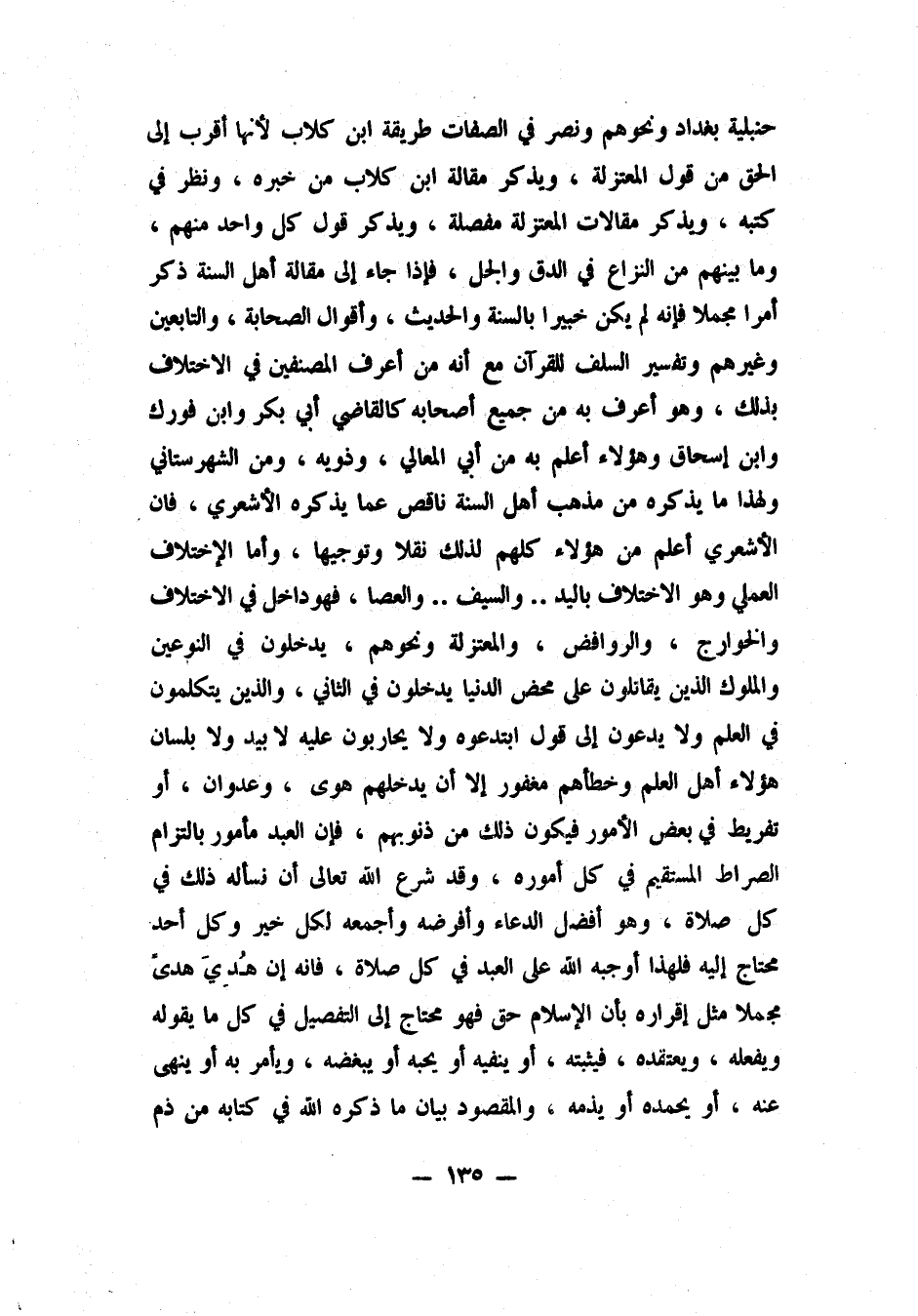 حنبلية بغداد ونحوهم، ونصر في الصفات طريقة ابن كلاب لأنها أقرب إلى الحق من قول المعتزلة، ويذكر مقالة ابن كلاب من خبره، ونظر في كتبه، ويذكر مقالات المعتزلة مفصلة، ويذكر قول كل واحد منهم، وما بينهم من النّزاع في الدق والجل، فإذا جاء إلى مقالة أهل السنة ذكر أمرا مجملا، فإنه لم يكن خبيرا بالسنة والحديث، وأقوال الصحابة والتابعين، وغيرهم، وتفسير السلف للقرآن، مع أنه من أعرف المصنفين في الاختلاف بذلك، وهو أعرف به من جميع أصحابه كالقاضي أبي بكر وابن فورك وابن إسحاق، وهؤلاء أعلم به من أبي المعالي وذويه، ومن الشهرستاني، ولهذا ما يذكره من مذهب أهل السنة ناقص عما يذكره الأشعري، فإن الأشعري أعلم من هؤلاء كلهم لذلك نقلا وتوجيها. وأما الاختلاف العملي وهو الاختلاف باليد والسيف والعصا، فهو داخل في الاختلاف، والخوارج والروافض والمعتزلة ونحوهم، يدخلون في النوعين، والملوك الذين يقاتلون على محض الدنيا يدخلون في الثاني. والذين يتكلمون في العلم ولا يدعون إلى قول ابتدعوه ولا يحاربون عليه لا بيد ولا بلسان، هؤلاء أهل العلم وخطؤهم مغفور إلا أن يدخلهم هوى، وعدوان، أو تفريط في بعض الأمور فيكون ذلك من ذنوبهم.