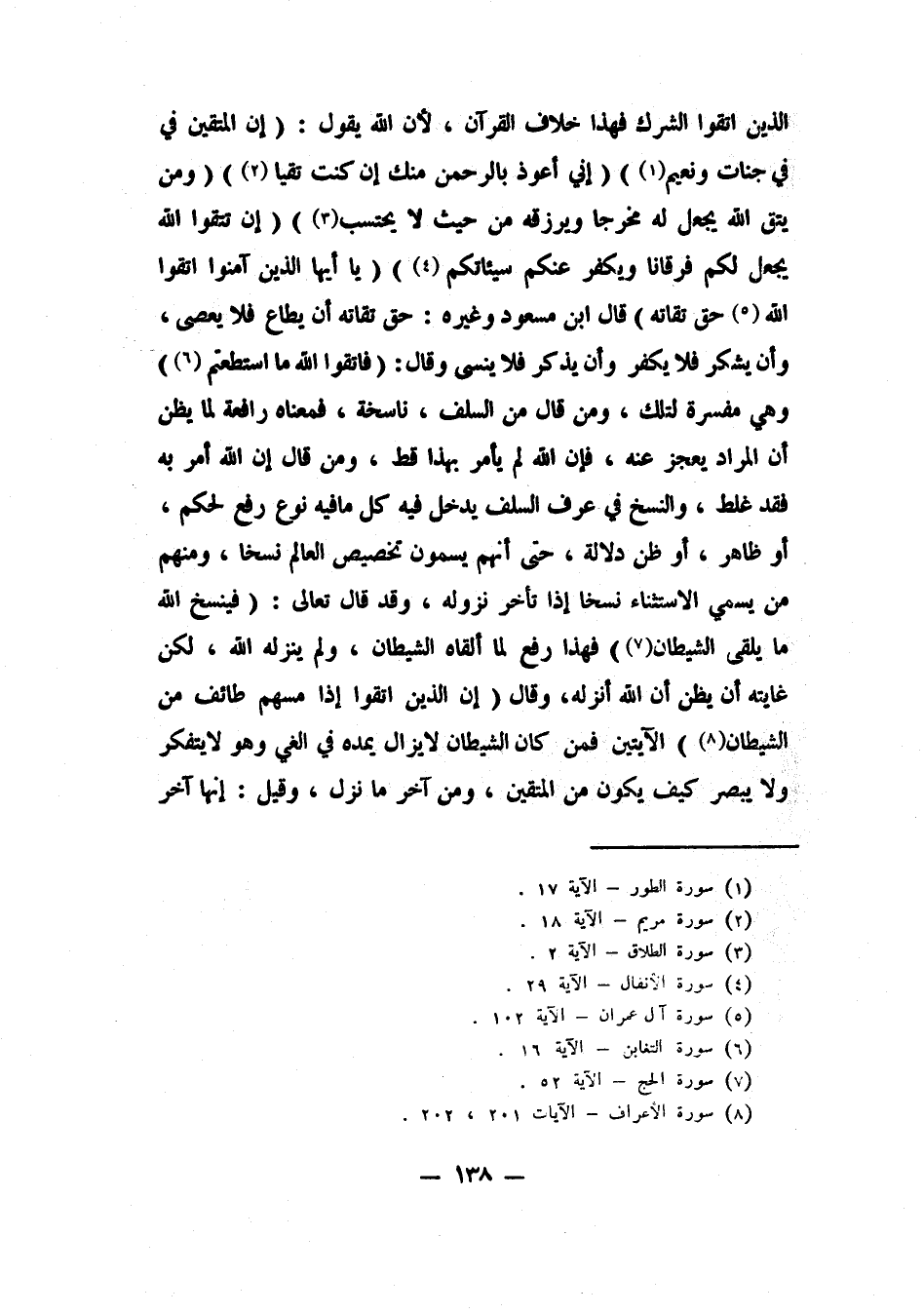 الذين اتقوا الشرك، فهذا خلاف القرآن، لأن الله يقول: {إِنَّ الْمُتَّقِينَ فِي جَنَّاتٍ وَنَعِيمٍ} 1، {إِنِّي أَعُوذُ بِالرَّحْمَنِ مِنْكَ إِنْ كُنْتَ تَقِيّاً} 2، {وَمَنْ يَتَّقِ اللَّهَ يَجْعَلْ لَهُ مَخْرَجاً وَيَرْزُقْهُ مِنْ حَيْثُ لا يَحْتَسِبُ} 3، {إِنْ تَتَّقُوا اللَّهَ يَجْعَلْ لَكُمْ فُرْقَاناً وَيُكَفِّرْ عَنْكُمْ سَيِّئَاتِكُمْ} 4، {يَا أَيُّهَا الَّذِينَ آمَنُوا اتَّقُوا اللَّهَ حَقَّ تُقَاتِهِ} 5، قال ابن مسعود وغيره: " {حق تقاته} أن يطاع فلا يعصى، وأن يشكر فلا يكفر، وأن يذكر فلا ينسى" وقال: {فَاتَّقُوا اللَّهَ مَا اسْتَطَعْتُمْ} 6 وهي مفسرة لتلك؛ ومن قال من السلف، ناسخة، فمعناه رافعة لما يظن أن المراد يعجز عنه. فإن الله لم يأمر بهذا قط، ومن قال: إن الله أمر به، فقد غلط. والنسخ في عرف السلف يدخل فيه كل ما فيه نوع رفع لحكم، أو ظاهر، أو ظن دلالة، حتى إنهم يسمون تخصيص العالم نسخا، ومنهم من يسمي الاستثناء نسخا إذا تأخر نزوله.