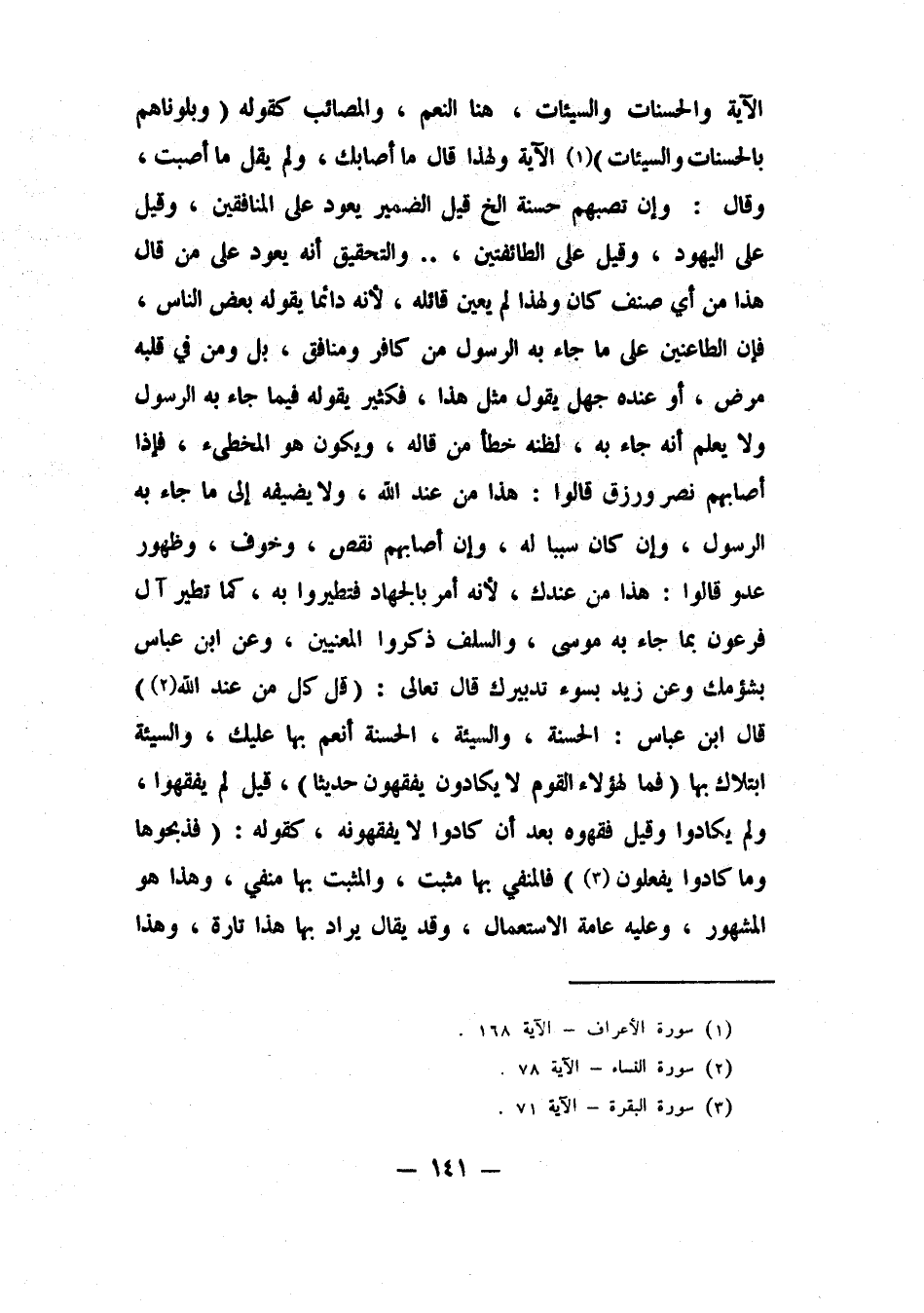 الآية. والحسنات والسيئات، هنا النعم، والمصائب كقوله {وَبَلَوْنَاهُمْ بِالْحَسَنَاتِ وَالسَّيِّئاتِ} 1 الآية ولهذا قال: {ما أصابك} ولم يقل ما أصبت، وقال: {وإن تصبهم حسنة} إلخ، قيل: الضمير يعود على المنافقين، وقيل: على اليهود، وقيل: على الطائفتين. والتحقيق أنه يعود على من قال هذا، من أي صنف كان، ولهذا لم يعين قائله، لأنه دائما يقوله بعض الناس.