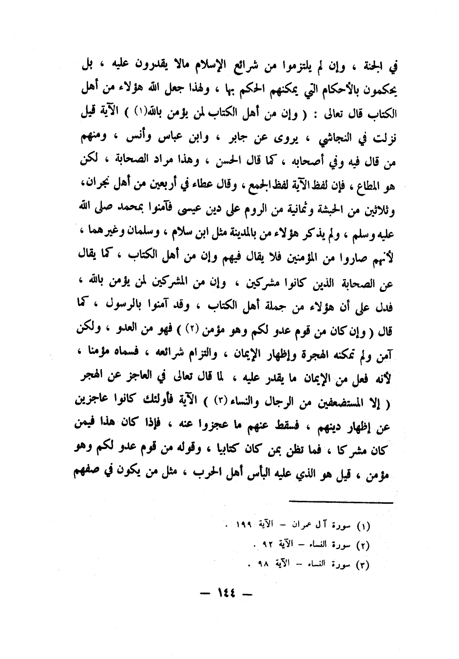 في الجنة، وإن لم يلتزموا من شرائع الإسلام ما لا يقدرون عليه، بل يحكمون بالأحكام التي يمكنهم الحكم بها، ولهذا جعل الله هؤلاء من أهل الكتاب قال تعالى: {وَإِنَّ مِنْ أَهْلِ الْكِتَابِ لَمَنْ يُؤْمِنُ بِاللَّهِ} 1 الآية قيل نزلت في النجاشي، يروى عن جابر، وابن عباس، وأنس، ومنهم من قال فيه وفي أصحابه، كما قال الحسن وهذا مراد الصحابة، لكن هو المطاع، فإن لفظ الآية لفظ الجمع. وقال عطاء في أربعين من أهل نجران وثلاثين من الحبشة وثمانية من الروم على دين عيسى فآمنوا بمحمد صلى الله عليه وسلم، ولم يذكر هؤلاء من بالمدينة مثل ابن سلام، وسلمان وغيرهما، لأنهم صاروا من المؤمنين فلا يقال فيهم: {وإن من أهل الكتاب} ، كما يقال عن الصحابة الذين كانوا مشركين، وإن من المشركين لمن يؤمن بالله، فدل على أن هؤلاء من جملة أهل الكتاب، وقد آمنوا بالرسول، كما قال: {فَإِنْ كَانَ مِنْ قَوْمٍ عَدُوٍّ لَكُمْ وَهُوَ مُؤْمِنٌ} 2 فهو من العدو، ولكن آمن ولم تمكنه الهجرة وإظهار الإيمان والتزام شرائعه، فسماه مؤمنا، لأنه فعل من الإيمان ما يقدر عليه، لما قال تعالى في العاجز عن الهجرة: {إِلَّا الْمُسْتَضْعَفِينَ مِنَ الرِّجَالِ وَالنِّسَاءِ} 3 الآية، فأولئك كانوا عاجزين عن إظهار دينهم، فسقط عنهم ما عجزوا عنه.