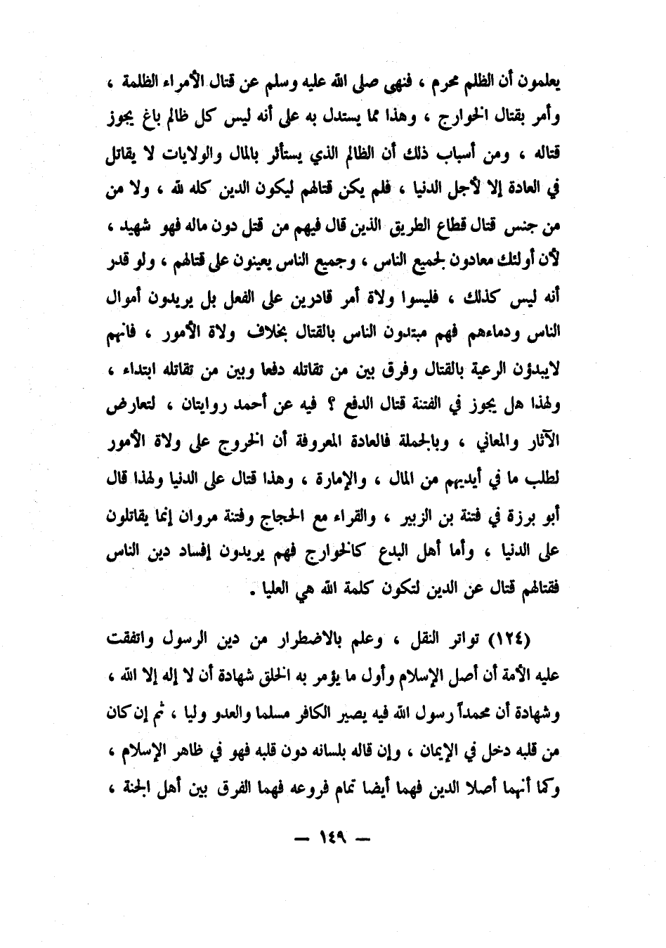 ولهذا هل يجوز في الفتنة قتال الدفع؟ فيه عن أحمد روايتان؛ لتعارض الآثار والمعاني. وبالجملة فالعادة المعروفة أن الخروج على ولاة الأمور لطلب ما في أيديهم من المال، والإمارة، وهذا قتال على الدنيا، ولهذا قال أبو برزة في فتنة ابن الزبير والقراء مع الحجاج، وفتنة مروان: إنما يقاتلون على الدنيا، وأما أهل البدع كالخوارج فهم يريدون إفساد دين الناس، فقتالهم قتال عن الدين لتكون كلمة الله هي العليا.