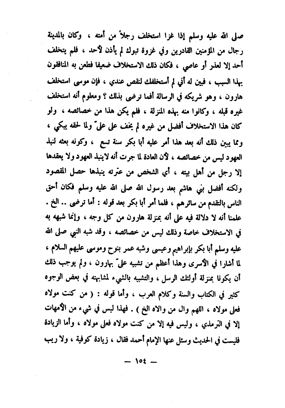 صلى الله عليه وسلم إذا غزا استخلف رجلا من أمته، وكان بالمدينة رجال من المؤمنين القادرين، وفي غزوة تبوك لم يأذن لأحد، فلم يتخلف أحد إلا لعذر أو إلا عاصٍ، فكان ذلك الاستخلاف ضعيفا فطعن به المنافقون بهذا السبب، فبين له أني لم استخلفك لنقص عندي، فإن موسى استخلف هارون وهو شريكه في الرسالة، أفما ترضى بذلك؟ ومعلوم أنه استخلف غيره قبله، وكانوا منه بهذه المنْزلة، فلم يكن هذا من خصائصه. ولو كان هذا الاستخلاف أفضل من غيره لم يخف على علي، ولما لحقه يبكي، ومما يبين ذلك أنه بعد هذا أمر عليه أبا بكر سنة تسع. وكونه بعثه لنبذ العهود ليس من خصائصه، لأن العادة لما جرت أنه لا ينبذ العهود ولا يعقدها إلا رجل من أهل بيته، أي الشخص من عترته ينبذها حصل المقصود، ولكنه أفضل بني هاشم بعد رسول الله صلى الله عليه وسلم فكان أحق الناس بالتقدم من سائرهم.