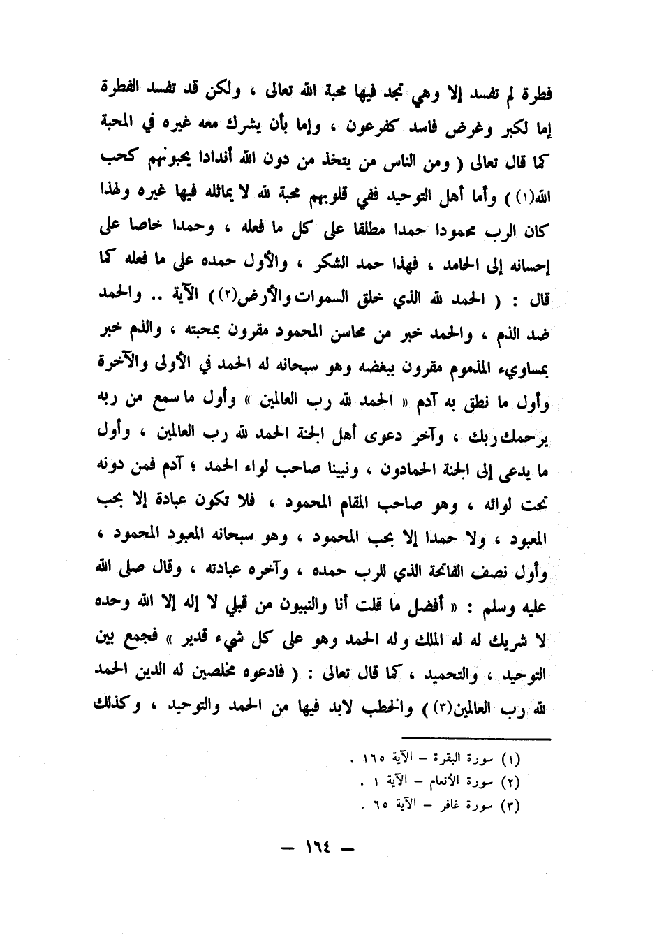 فطرة لم تفسد إلا وهي تجد فيها محبة الله تعالى. ولكن قد تفسد الفطرة إما لكبر وغرض فاسد كفرعون، وإما بأن يشرك معه غيره في المحبة كما قال تعالى: {وَمِنَ النَّاسِ مَنْ يَتَّخِذُ مِنْ دُونِ اللَّهِ أَنْدَاداً يُحِبُّونَهُمْ كَحُبِّ اللَّهِ} 1. وأما أهل التوحيد ففي قلوبهم محبة لله لا يماثله فيها غيره، ولهذا كان الرب محمودا حمدا مطلقا على كل ما فعله، وحمدا خاصا على إحسانه إلى الحامد، فهذا حمد الشكر، والأول حمده على ما فعله كما قال: {الْحَمْدُ لِلَّهِ الَّذِي خَلَقَ السَّمَاوَاتِ وَالْأَرْضَ} 2 الآية.