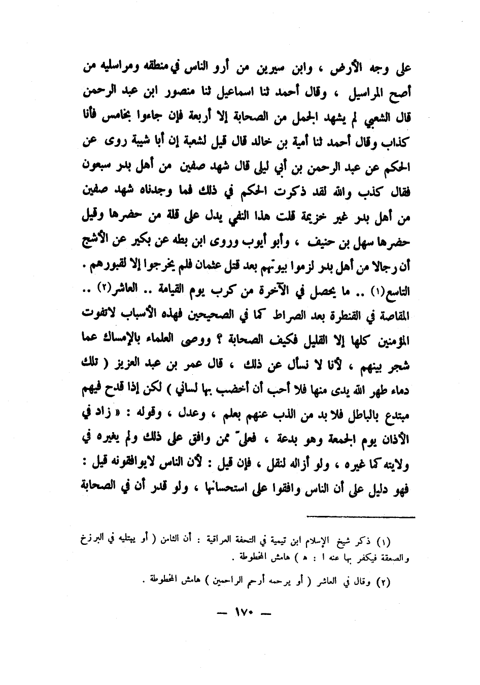 العاشر 2: المقاصة في القنطرة بعد الصراط كما في الصحيحين. فهذه الأسباب لا تفوت المؤمنين كلها إلا القليل فكيف الصحابة؟ ووصى العلماء بالإمساك عما شجر بينهم، لأنا لا نسأل عن ذلك، قال عمر بن عبد العزيز: "تلك دماء طهر الله يدي منها، فلا أحب أن أخضب بها لساني". لكن إذا قدح فيهم مبتدع بالباطل، فلا بد من الذب عنهم بعلم وعدل، وقوله: زاد في الأذان يوم الجمعة وهو بدعة، فعلي ممن وافق على ذلك ولم يغيره في ولايته كما غير غيره، ولو أزاله لنقل، فإن قيل: لأن الناس لا يوافقونه، قيل: فهو دليل على أن الناس وافقوا على استحسانها، ولو قدر أن في الصحابة