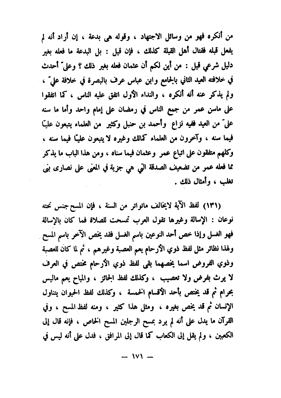 فإن المسح جنس تحته نوعان: الإسالة وغيرها، تقول العرب: تمسحت للصلاة، فما كان بالإسالة فهو الغسل، وإذا خص أحد النوعين باسم الغسل فقد يخص الآخر باسم المسح. ولهذا نظائر مثل لفظ: "ذوي الأرحام" يعم العصبة وغيرهم، ثم لما كان للعصبة وذوي الفروض اسما يخصهما بقي لفظ "ذوي الأرحام" مختصا في العرف، لا يرث بفرض ولا تعصيب. وكذلك لفظ الجائز والمباح يعم ما ليس بحرام، ثم قد يختص بأحد الأقسام الخمسة. وكذلك لفظ الحيوان يتناول الإنسان ثم قد يخص بغيره. ومثل هذا كثير، ومنه لفظ المسح، وفي القرآن ما يدل على أنه لم يرد بمسح الرجلين المسح الخاص، فإنه قال {إلى الكعبين} ، ولم يقل إلى الكعاب كما قال إلى المرافق، فدل على أنه ليس في