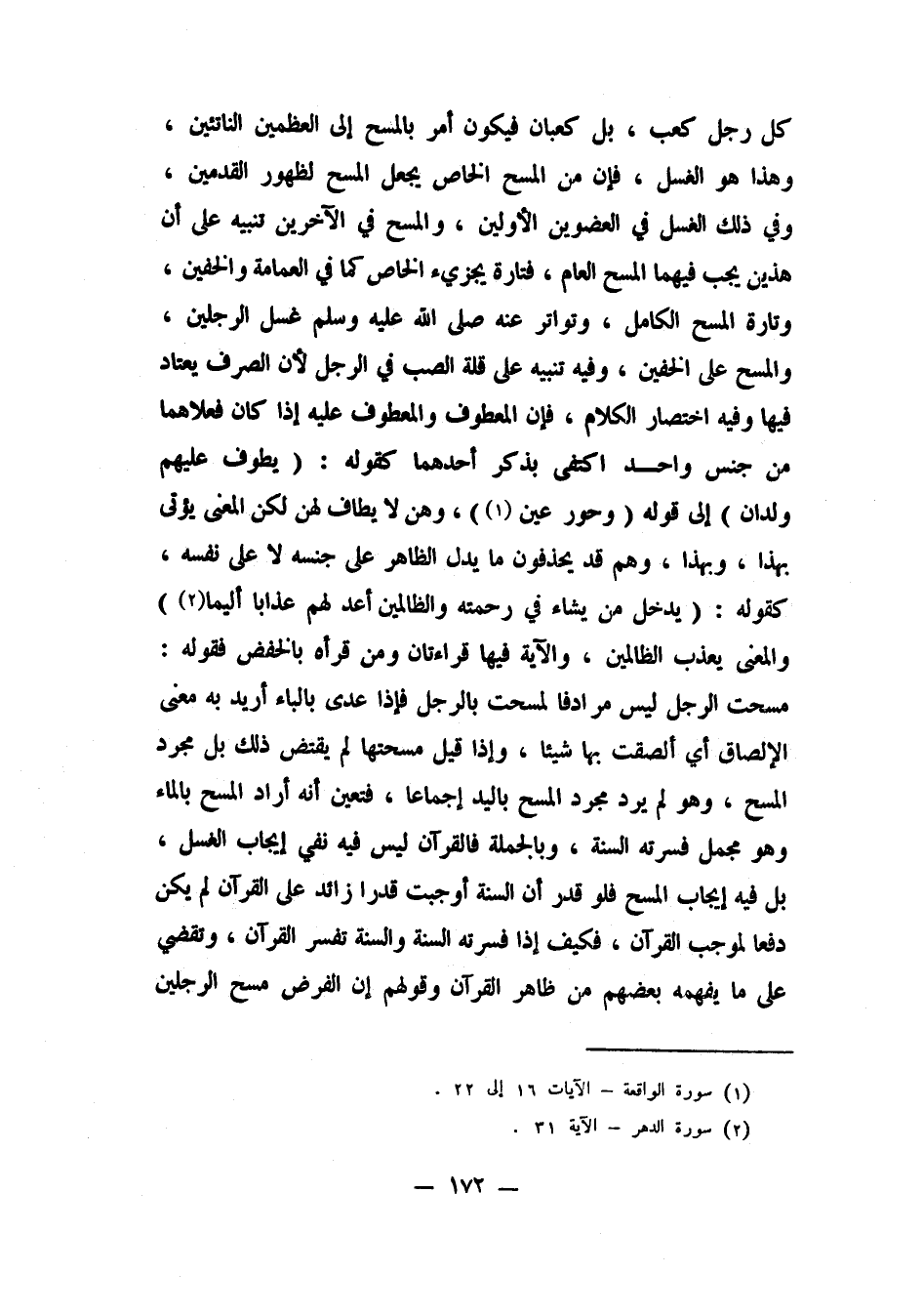 كل رجل كعب، بل كعبان؛ فيكون أمر بالمسح إلى العظمين الناتئين، وهذا هو الغسل؛ فإن من يسمح المسح الخاص يجعل المسح لظهور القدمين. وفي ذكره الغسل في العضوين الأولين، والمسح في الآخرين تنبيه على أن هذين يجب فيهما المسح العام، فتارة يجزئ الخاص كما في العمامة والخفين، وتارة المسح الكامل. وتواتر عنه صلى الله عليه وسلم غسل الرجلين، والمسح على الخفين. وفيه تنبيه على قلة الصب في الرجل، لأن السرف يعتاد فيها وفية اختصار الكلام، فإن المعطوف والمعطوف عليه إذا كان فعلاهما من جنس واحد اكتفي بذكر أحدهما كقوله: {يَطُوفُ عَلَيْهِمْ وِلْدَانٌ} إلى قوله {وَحُورٌ عِينٌ} وهن لا يطاف لهن لكن المعنى يؤتى بهذا، وبهذا. وهم قد يحذفون ما يدل الظاهر على جنسه لا على نفسه، كقوله: {يُدْخِلُ مَنْ يَشَاءُ فِي رَحْمَتِهِ وَالظَّالِمِينَ أَعَدَّ لَهُمْ عَذَاباً أَلِيماً} 1 والمعنى يعذب الظالمين، والآية فيها قراءتان، ومن قرأه بالخفض يكون المعنى فامسحوا برؤوسكم، وامسحوا أرجلكم إلى الكعبين.