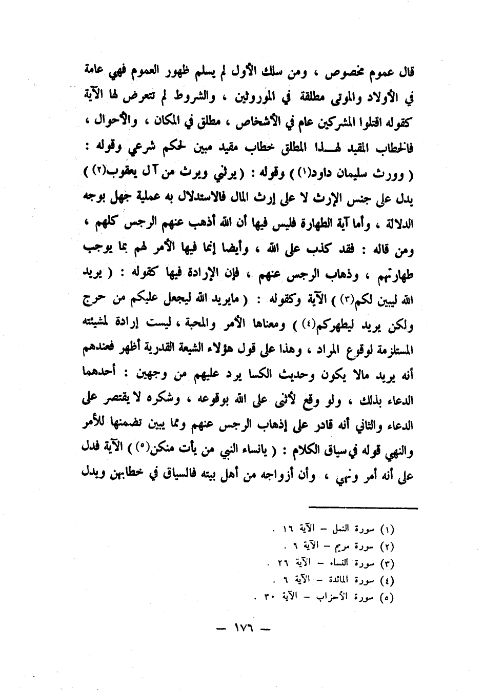 وأما آية الطهارة فليس فيها أن الله أذهب عنهم الرجس كلهم، ومن قاله فقد كذب على الله؛ وأيضا إنما فيها الأمر لهم بما يوجب طهارتهم، وذهاب الرجس عنهم، فإن الإرادة فيها كقوله: {يُرِيدُ اللَّهُ لِيُبَيِّنَ لَكُمْ} الآية، وكقوله: {مَا يُرِيدُ اللَّهُ لِيَجْعَلَ عَلَيْكُمْ مِنْ حَرَجٍ وَلَكِنْ يُرِيدُ لِيُطَهِّرَكُمْ} 3، ومعناها الأمر والمحبة، ليست إرادة لمشيئته المستلزمة لوقوع المراد، وهذا على قول هؤلاء الشيعة القدرية أظهر، فعندهم أنه يريد ما لا يكون، وحديث الكساء يرد عليهم من وجهين: