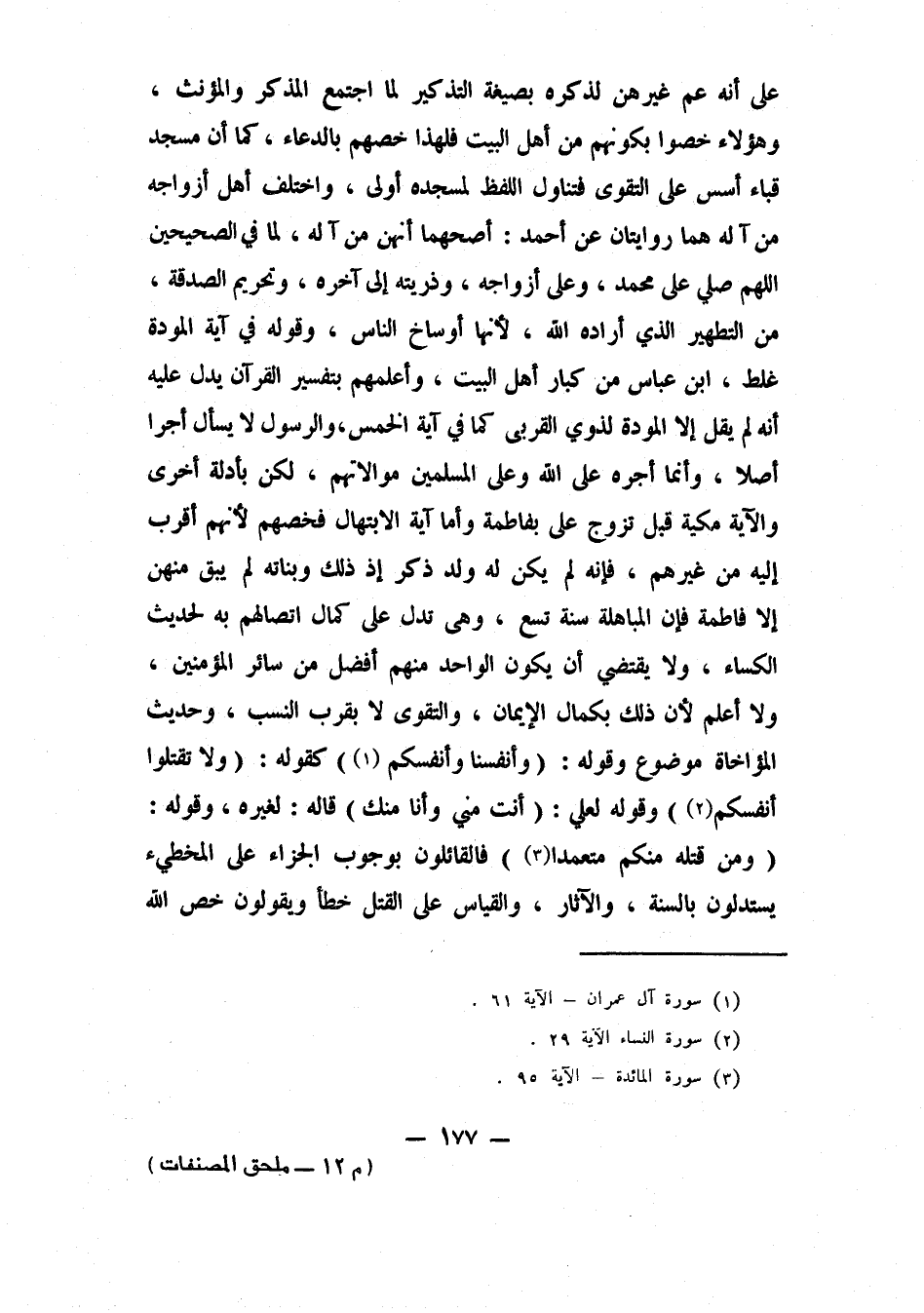على أنه عم غيرهن لذكره بصيغة التذكير لما اجتمع المذكر والمؤنث، وهؤلاء خصوا بكونهم من أهل البيت فلهذا خصهم بالدعاء، كما أن مسجد قباء أسس على التقوى فتناول اللفظ لمسجده أولى. واختلف هل أزواجه من آله؟ هما روايتان عن أحمد: أصحهما أنهن من آله، لما في الصحيحين: "اللهم صلِّ على محمد، وعلى أزواجه، وذريته" إلى آخره، وتحريم الصدقة، من التطهير الذي أراده الله، لأنها أوساخ الناس. وقوله في آية المودة غلط، ابن عباس من كبار أهل البيت، وأعلمهم بتفسير القرآن يدل عليه أنه لم يقل إلا المودة لذوي القربى كما في آية الخمس، والرسول لا يسأل أجرا أصلا، وإنما أجره على الله، وعلى المسلمين موالاتهم، لكن بأدلة أخرى، والآية مكية قبل تزوج علي بفاطمة. وأما آية الابتهال فخصهم لأنهم أقرب إليه من غيرهم، فإنه لم يكن له ولد ذكر إذ ذاك، وبناته لم يبق منهن إلا فاطمة، فإن المباهلة سنة تسع، وهي تدل على كمال اتصالهم به لحديث الكساء، ولا يقتضي أن يكون الواحد منهم أفضل من سائر المؤمنين ولا أعلم؛ لأن ذلك بكمال الإيمان والتقوى، لا بقرب النسب. وحديث المؤاخاة موضوع وقوله: