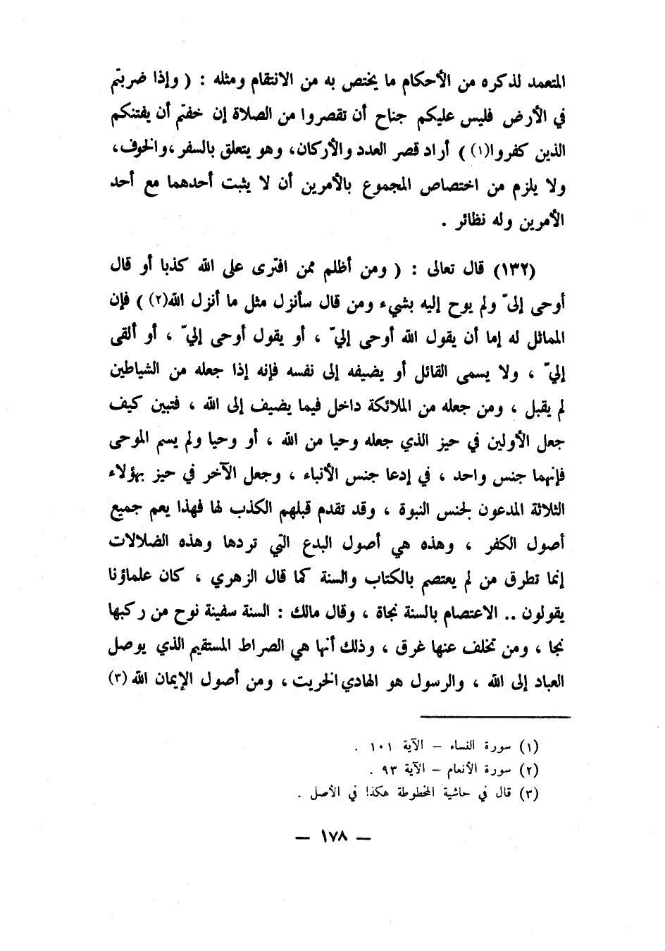 فإن المماثل له إما أن يقول: الله أوحى إلي، أو يقول: أوحي إلي، أو ألقي إلي، ولا يسمى القائل، أو يضيفه إلى نفسه؛ فإنه إذا جعله من الشياطين لم يقبل، ومن جعله من الملائكة داخل فيما يضيف إلى الله؛ فتبين كيف جعل الأولين في حيز الذي جعله وحيا من الله، أو وحيا ولم يسم الموحي، فإنهما جنس واحد، في ادعاء جنس الأنباء، وجعل الآخر في حيز بهؤلاء الثلاثة المدعون لجنس النبوة، وقد تقدم قبلهم الكذب لها، فهذا يعم جميع أصول الكفر، وهذه هي أصول البدع التي تردها. وهذه الضلالات إنما تطرق من لم يعتصم بالكتاب والسنة كما قال الزهري: كان علماؤنا يقولون: الاعتصام بالسنة نجاة، وقال مالك: السنة سفينة نوح، من ركبها نجا، ومن تخلف عنها غرق، وذلك أنها هي الصراط المستقيم الذي يوصل العباد إلى الله، والرسول هو الهادي الخريت. ومن أصول الإيمان: الله 3
