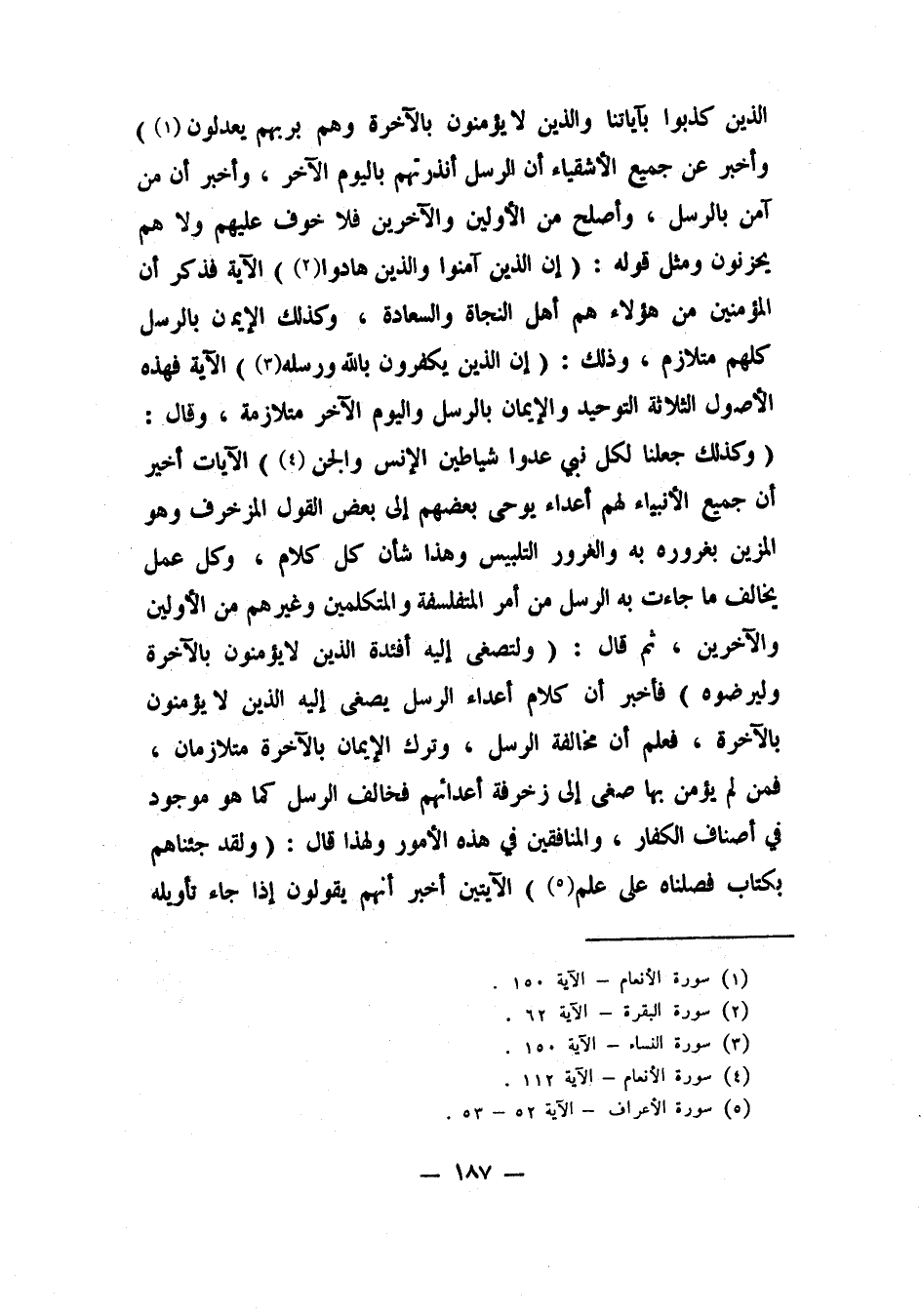 الَّذِينَ كَذَّبُوا بِآياتِنَا وَالَّذِينَ لا يُؤْمِنُونَ بِالْآخِرَةِ وَهُمْ بِرَبِّهِمْ يَعْدِلُونَ} 1، وأخبر عن جميع الأشقياء أن الرسل أنذرتهم باليوم الآخر، وأخبر أن من آمن بالرسل، وأصلح من الأولين والآخرين فلا خوف عليهم ولا هم يحزنون، ومثل قوله: {إِنَّ الَّذِينَ آمَنُوا وَالَّذِينَ هَادُوا} الآية، فذكر أن المؤمنين من هؤلاء هم أهل النجاة والسعادة، وكذلك الإيمان بالرسل كلهم متلازم، وذلك: {إِنَّ الَّذِينَ يَكْفُرُونَ بِاللَّهِ وَرُسُلِهِ} الآية. فهذه الأصول الثلاثة التوحيد والإيمان بالرسل واليوم الآخر متلازمة، وقال: {وَكَذَلِكَ جَعَلْنَا لِكُلِّ نَبِيٍّ عَدُوّاً شَيَاطِينَ الْأِنْسِ وَالْجِنِّ} 2 الآيات، أخبر أن جميع الأنبياء لهم أعداء يوحي بعضهم إلى بعض القول المزخرف، وهو المزين بغروره به، والغرور التلبيس، وهذا شأن كل كلام، وكل عمل يخالف ما جاءت به الرسل من أمر المتفلسفة والمتكلمين وغيرهم من الأولين والآخرين. ثم قال: {وَلِتَصْغَى إِلَيْهِ أَفْئِدَةُ الَّذِينَ لا يُؤْمِنُونَ بِالْآخِرَةِ وَلِيَرْضَوْهُ} 3، فأخبر أن كلام أعداء الرسل يصغي إليه الذين لا يؤمنون بالآخرة؛ فعلم أن مخالفة الرسل وترك الإيمان بالآخرة متلازمان؛ فمن لم يؤمن بها صغى إلى زخرفة أعدائهم فخالف الرسل، كما هو موجود في أصناف الكفار والمنافقين في هذه الأمور، ولهذا قال: {وَلَقَدْ جِئْنَاهُمْ بِكِتَابٍ فَصَّلْنَاهُ عَلَى عِلْمٍ} الآيتين. أخبر أنهم يقولون إذا جاء تأويله: