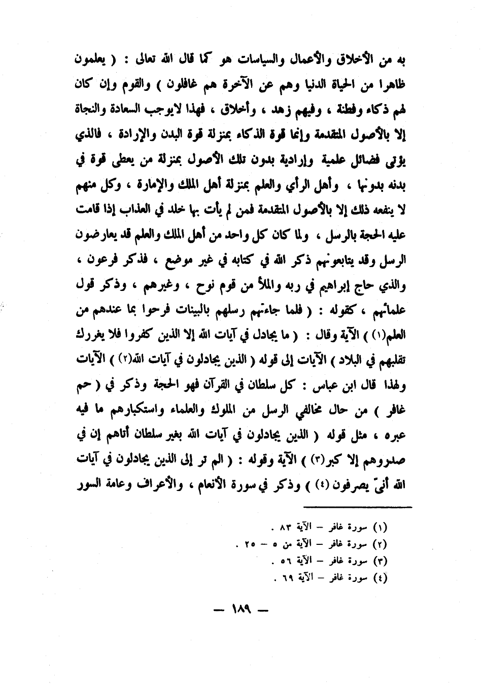 به من الأخلاق والأعمال والسياسات هو كما قال الله تعالى: {يَعْلَمُونَ ظَاهِراً مِنَ الْحَيَاةِ الدُّنْيَا وَهُمْ عَنِ الْآخِرَةِ هُمْ غَافِلُونَ} 1. والقوم وإن كان لهم ذكاء وفطنة، وفيهم زهد وأخلاق، فهذا لا يوجب السعادة والنجاة إلا بالأصول المتقدمة، وإنما قوة الذكاء بمنْزلة قوة البدن والإرادة، فالذي يؤتى فضائل علمية وإرادية بدون تلك الأصول بمنْزلة من يعطى قوة في بدنه بدونها، وأهل الرأي والعلم بمنْزلة أهل الملك والإمارة، وكل منهم لا ينفعه ذلك إلا بالأصول المتقدمة؛ فمن لم يأت بها خلد في العذاب إذا قامت عليه الحجة بالرسل، ولما كان كل واحد من أهل الملك والعلم قد يعارضون الرسل وقد يتابعونهم، ذكرهم الله في كتابه في غير موضع، فذكر فرعون، والذي حاج إبراهيم في ربه، والملأ من قوم نوح وغيرهم، وذكر قول علمائهم كقوله: {فَلَمَّا جَاءَتْهُمْ رُسُلُهُمْ بِالْبَيِّنَاتِ فَرِحُوا بِمَا عِنْدَهُمْ مِنَ الْعِلْمِ} 2 الآية، وقال: {مَا يُجَادِلُ فِي آيَاتِ اللَّهِ إِلَّا الَّذِينَ كَفَرُوا فَلا يَغْرُرْكَ تَقَلُّبُهُمْ فِي الْبِلادِ} 3 الآيات، إلى قوله: {الَّذِينَ يُجَادِلُونَ فِي آيَاتِ اللَّهِ} الآيات، ولهذا قال ابن عباس: "كل سلطان في القرآن فهو الحجة" وذكر في (حم غافر) من حال مخالفي الرسل من الملوك والعلماء واستكبارهم ما فيه عبرة، مثل قوله {إِنَّ الَّذِينَ يُجَادِلُونَ فِي آيَاتِ اللَّهِ بِغَيْرِ سُلْطَانٍ أَتَاهُمْ إِنْ فِي صُدُورِهِمْ إِلَّا كِبْرٌ} 4 الآية، وقوله: {أَلَمْ تَرَ إِلَى الَّذِينَ يُجَادِلُونَ فِي آيَاتِ اللَّهِ أَنَّى يُصْرَفُونَ} 5 وذكر في سورة الأنعام والأعراف وعامة السور