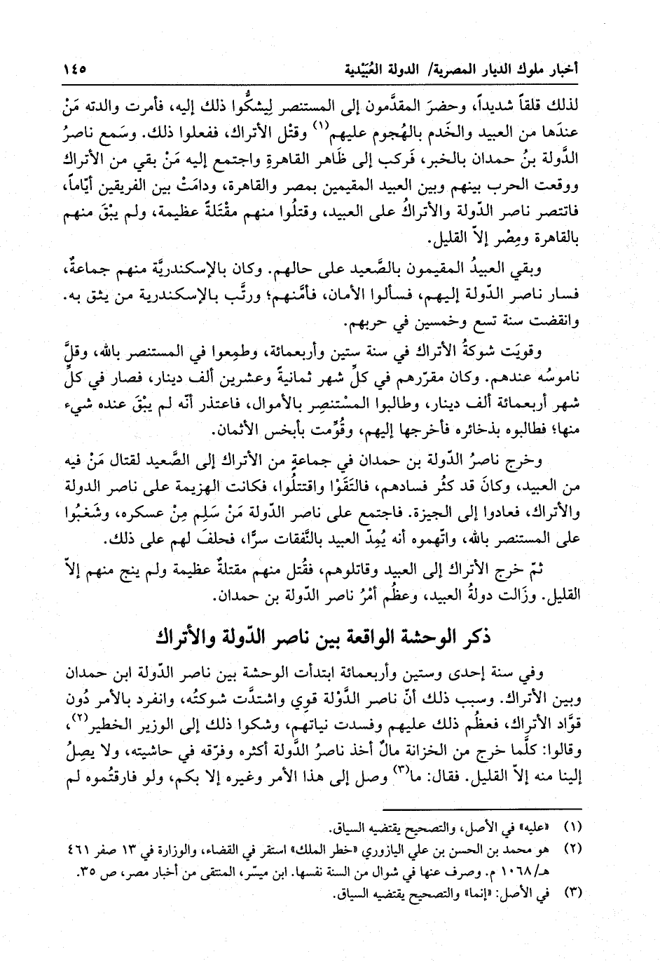 وفي سنة إحدى وستين وأربعمائة ابتدأت الوحشة بين ناصر الدولة بن حمدان وبين الأتراك . وسبب ذلك أن ناصر الدولة قوي واشتدت شوكته ، وانفرد بالأمر دون قواد الأتراك ، فعظم ذلك عليهم وفسدت نياتهم 68 وشكوا ذلك إلى الوزير الخطير ، وقالوا : كلما خرج من الخزانة مال أخذ ناصر الدولة أكثره وفرقه في حاشيته ، ولايصل إلينا منه إلا القليل . فقال : ما وصل هذا الأمر وغيره إلا بكم ، ولو فارقتموه لم