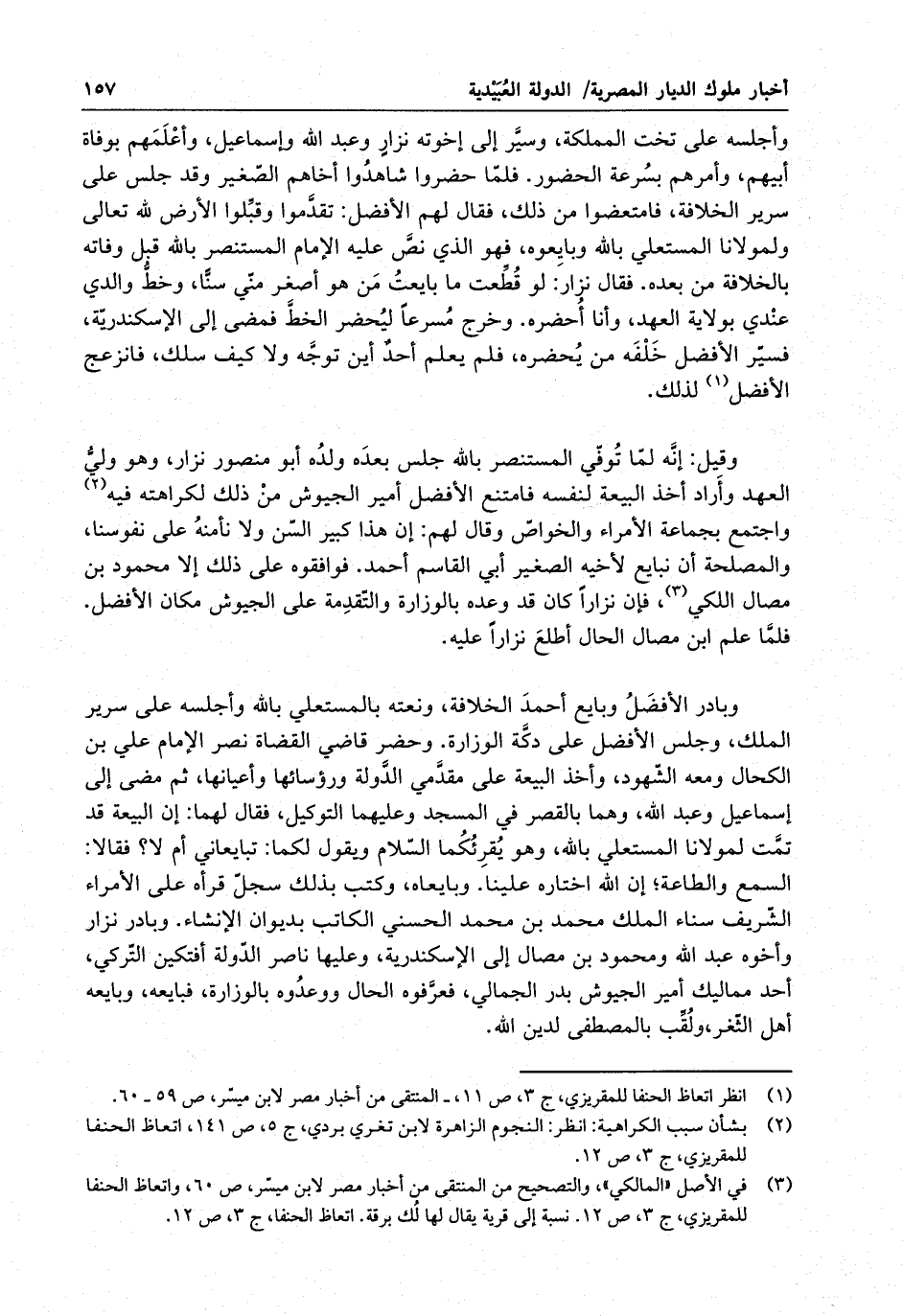 وأجلسه على تخت المملكة ، وسير إلى إخوته نزار وعبد الله وإسماعيل ، وأعلمهم بوفاة أبيهم ، وأمرهم بسرعة الحضور ، فلما حضروا شاهدوا أخاهم الصغير وقد جلس على سرير الخلافة ، فامتعضوا من ذلك ، فقال لهم الأفضل : تقدموا وقبلوا الأرض لله تعالى ولمولانا المستعلي بالله وبايعوه ، فهو الذي نص عليه الإمام المستنصر بالله قبل وفاته بالخلافة من بعده ، فقال نزار : لو قطعت ما بايعت من هو أصغر مني سناً ، وخط والدي عندي بولاية العهد ، وأنا أحضره . وخرج مسرعاً ليحضر الخط فمضى إلى الإسكندرية ، فسير الأفضل خلفه من يحضره ، فلم يعلم أحد أين توجه ولا كيف سلك ، فانزعج الأفضل لذلك .