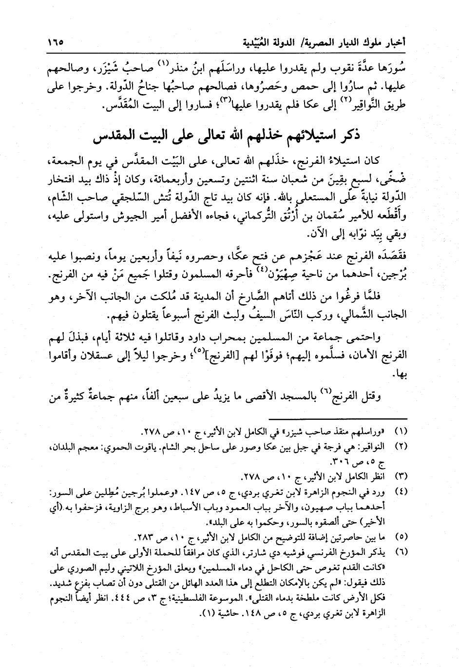 كان استيلاء الفرنج ، خذلهم الله تعالى ، على البيت المقدس في يوم الجمعة ، ضحى ، لسبع بقين من شعبان سنة اثنتين وتسعين وأربعمائة ، وكان إذ ذاك بيد افتخار الدولة نيابة عن المستعلي بالله ، فإنه كان بيد تاج الدولة تتش السلجقي صاحب الشام ، واقطعه للأمير سقمان بن أرتق التركماني ، فجاءه الأفضل أمير الجيوش واستولى عليه ، وبقي بيد نوابه إلى الآن .