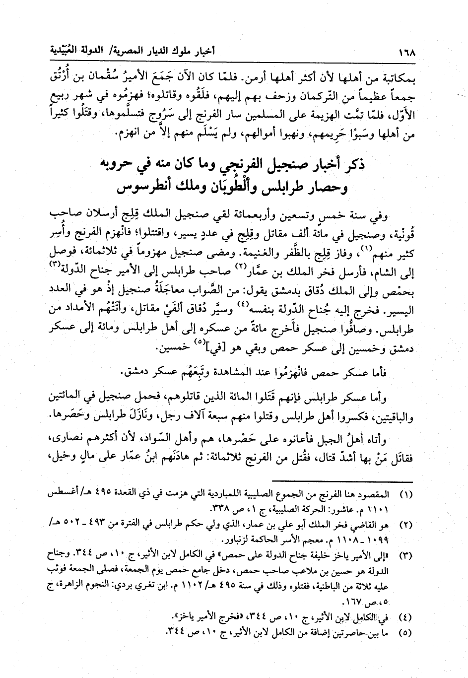 وأما عسكر طرابلس فإنهم قتلوا المائة الذين قاتلوهم ، فحمل صنجيل في المائتين الباقيتين ، فكسروا أهل طرابلس وقتلوا منهم سبعة آلاف رجل ونازل طرابلس وحصرها . وأتاه أهل الجبل فأعانوه على حصرها ، هم وأهل السواد ، لأن أكثرهم نصارى . فقاتل من بها أشد قتال ، فقتل من الفرنج ثلاثمائة : ثم هادنهم ابن عمار على مال وخيل ،