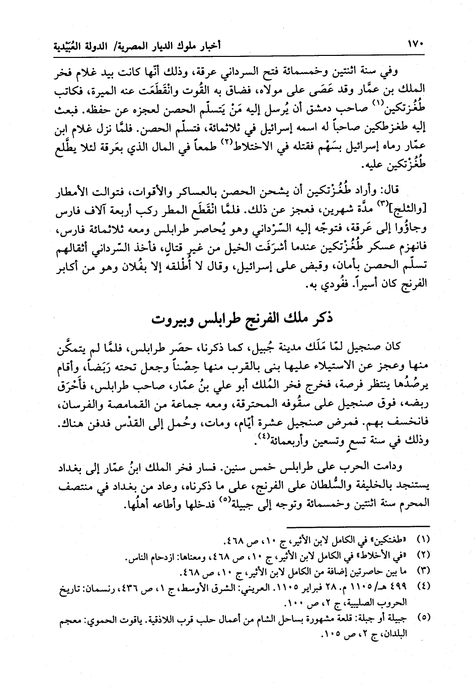 ودامت الحرب على طرابلس خمس سنين . فسار فخر الملك ابن عمار إلى بغداد يستنجد بالخليفة والسلطان على الفرنج ، على ما ذكرناه وعاد من بغداد في منتصف المحرم سنة اثنتين وخمسمائة وتوجه إلى جبيلة فدخلها وأطاعه أهلها .