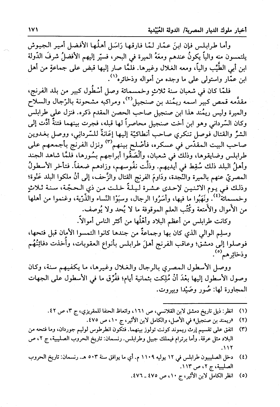 وأما طرابلس فإن ابن عمار لما فارقها راسل أهلها الأفضل أمير الجيوش يلتمسون منه والياً يكون عندهم ومعه الميرة في البحر ، فسير إليهم الأفضل شرف الدولة بن أبي الطيب والياً ، ومعه الغلال وغيرها . فلما صار إليها قبض على جماعة من أهل ابن عمار واستولى على ما وجده من أمواله وذخائره . فما كان في شعبان سنة ثلاث وخمسمائة وصل أسطول كبير من بلد الفرنج ، مقدمه قمص كبير اسمه ريمند بن صنجيل ، ومراكبه مشحونة بالرجال والسلاح والميرة وليس ربمند هذا ابن صنجيل صاحب الحصن المقدم ذكره . فنزل على طرابلس وكان السرداني وهو ابن أخت صنجيل محاصراً لها قبله ، فجرت بينهما فتنة أدت إلى الشر والقتال فوصل تتكري صاحب أنطاكية إليها إعانة للسرداني ، ووصل بغدوين صاحب البيت المقدس في عسكره ، فأصلح بينهم ونزل الفرنج بأجمعهم على طرابلس وضايقوها ، وذلك في شعبان ، وألصقوا أبراجهم بسورها ، فلما شاهد الجند وأهل البلد ذلك سقط في أيديهم ، وذلت نفوسهم ، وزادهم ضعفاً . فتأخر الأسطول المصري عنهم بالميرة والنجدة ، وداوم الفرنج القتال والزحف إلى أن ملكا البلد عنوة ، وذلك في يوم الاثنين لإحدى عشرة ليلة خلت من ذي الحجة ، سنة ثلاث وخمسمائة . ونهبوا ما فيها ، وأسروا الرجال ، وسبوا النساء والذرية ، وغنموا من أهلها من الأموال والأمتعة وكتب العلم الموقوفة ما لا يحد ولا يوصف .